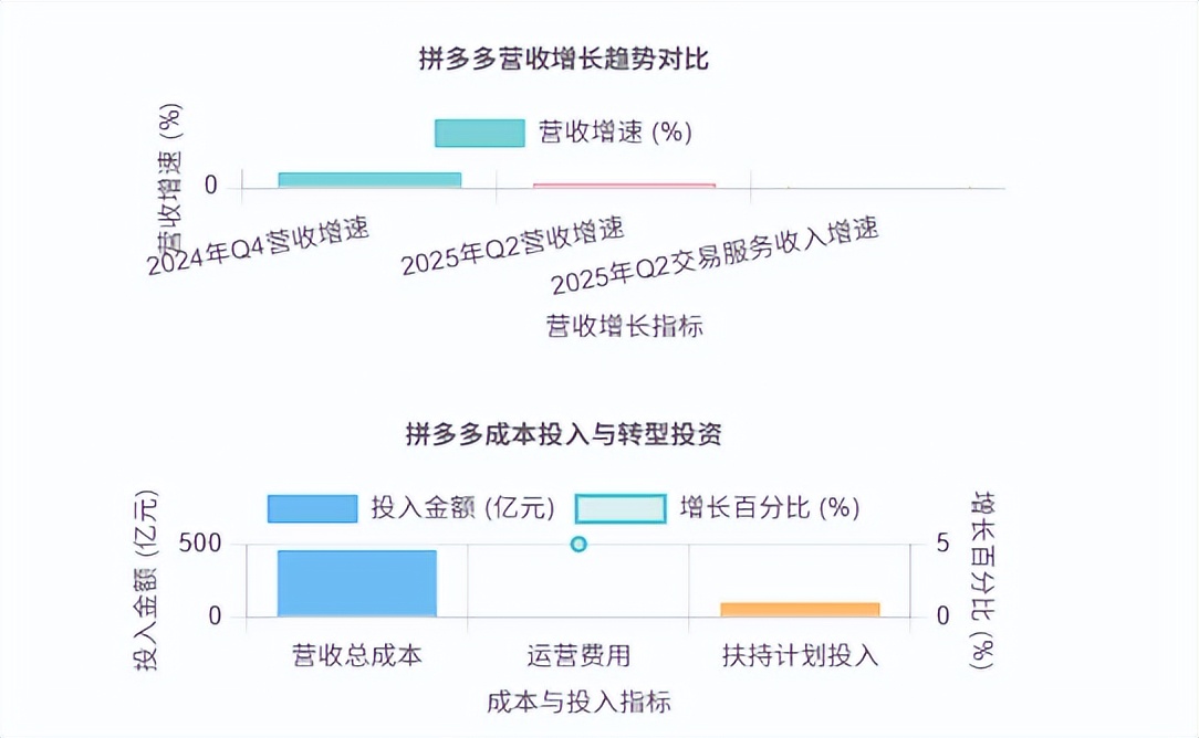 为应对增长压力,拼多多正在积极寻求转型。平台推出“新质商家扶持计划”,计划投入百亿资源从产品、营销、供应链等全方位推动产业带头部商家的新质转型。2025年第二季度,拼多多营收总成本为458.589亿元人民币,较去年同期增长36%,总运营费用也同比增长5%,显示出平台为提升商品品质和服务水平所进行的大规模投入。