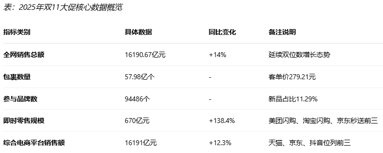 第一章:2025年双11大促市场概况1.1 总体销售业绩与增长态势2025年双11购物节于11月12日零点正式落下帷幕,这场历时超过一个月的消费盛宴最终以1.619万亿元的全网销售总金额收官,同比增长14%,延续了双位数增长态势。网经社电子商务研究中心获悉,本次大促共产生57.98亿个包裹,平均客单价为279.21元,展现出中国消费市场的强大韧性和内生活力。与往年相比,2025年双11呈现出明显的“增速放缓、玩法简化、价值深耕”新特征,标志着电商行业从粗放式增长向精细化运营的关键转变。