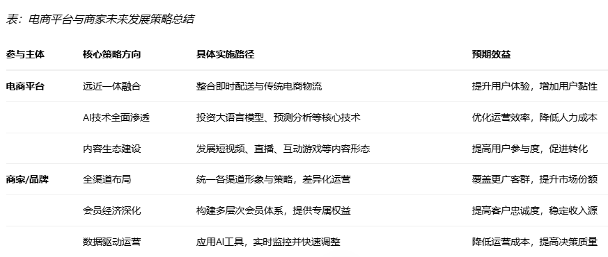 第五章:未来展望与策略建议5.1 电商平台的发展趋势与战略方向基于2025年双11的数据分析,电商平台未来的发展将呈现以下趋势:首先,即时零售与远场电商的深度融合将成为标准配置。淘宝闪购、京东秒送等即时零售服务已证明其通过高频消费带动低频消费的有效性。未来,平台将进一步加强“远近一体化”建设,整合即时配送与传统电商物流,为消费者提供更加多元化的交付选择。预计即时零售市场将持续快速增长,平台需提前布局运力网络、仓储设施和商品管理系统,以应对这一趋势带来的运营挑战。