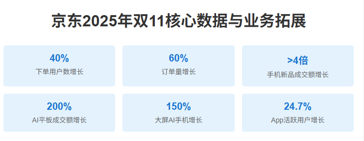 2.2 京东:供应链优势与业务拓展的双轨并行京东在2025年双11期间展现出强大的供应链能力和业务拓展力度。京东数据显示,截至11月11日23:59,京东双11成交额再创新高,下单用户数增长40%,订单量增长近60%。作为京东传统优势品类的带电产品表现亮眼,手机新品成交额同比增长超4倍,3C数码AI产品迎来爆发,AI平板成交额同比增长200%,大屏AI手机同比增长150%。