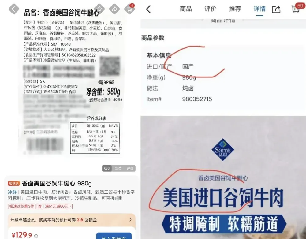 还有!比如牛腱心商品对供应商关键信息打码,以及谷饲牛肉明明在商品详情标签中写的来源是“国产”,在图片上却写的是“进口”。这引起了大家对其的质疑。