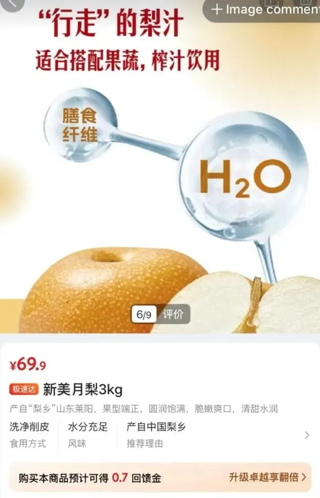以山姆比较出圈的新美月梨为例,真正的梨只占了一个溜边儿,一个水分子都跟梨差不多。