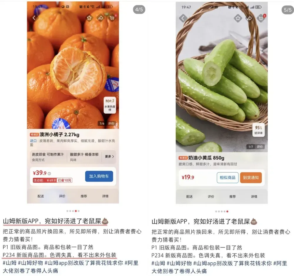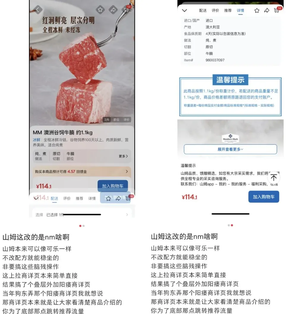 除了P图,商品信息模糊化、重点突出不清晰等,也是此次山姆App更新后的第二大槽点。