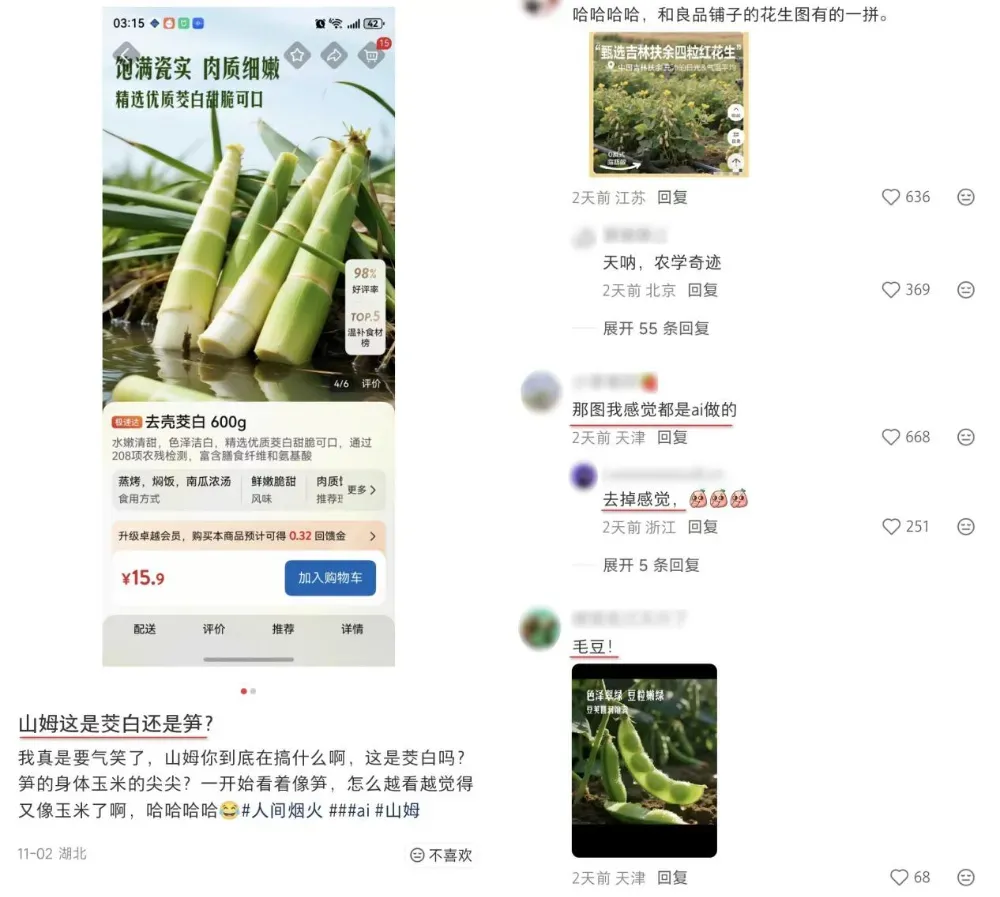 可是,在山姆更新后的App商品页面中,大家见到的茭白充满了AI科技味道的“伪笋感”,就像AI伪人的第6根手指!