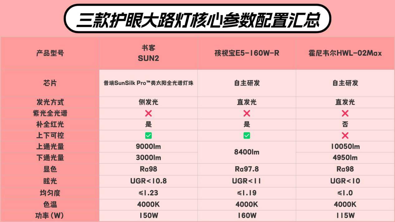 孩视宝台灯怎么样?在正式开始评测之前,我先做了一份参数对照表,把这三款护眼大路灯的核心参数都整理得一清二楚。之所以先从数据入手,是希望大家能有一个直观的参照基础,建议先花几分钟浏览这张表格,对每款产品的亮点和差异有个初步印象。这样在接下来的评测分析中,无论我提到光源结构还是照度表现,你都能更快抓住重点,看得更清楚。以下是三款护眼大路灯的核心参数: