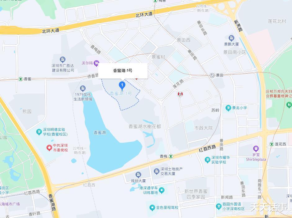 房子所在小区香蜜湖-1号,位于香蜜湖北侧,位置在深圳市确实非常好,距离深圳市行政、文化、商业商务中心非常近,直线距离莲花山公园大概1.5公里,直线距离市民广场大概2.5公里。附近有沃尔玛、深圳市福田区外国语学校(景田校区)、地铁站香梅北站等。