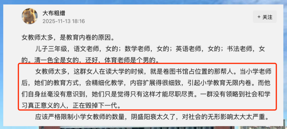 一位教育学者点破了问题的核心:“这不是男女教师性别比的选择题,而是完整人格与残缺成长之间的必答题。”