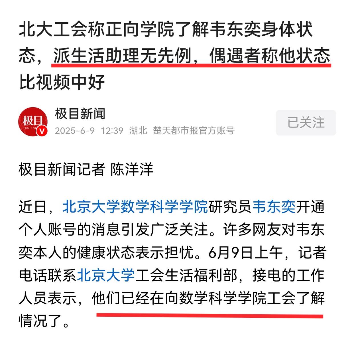 对于网友呼吁北大安排生活助理照顾韦神的提议,北大工会则表示此前没有先例,后面会向所在学院了解详细情况。
