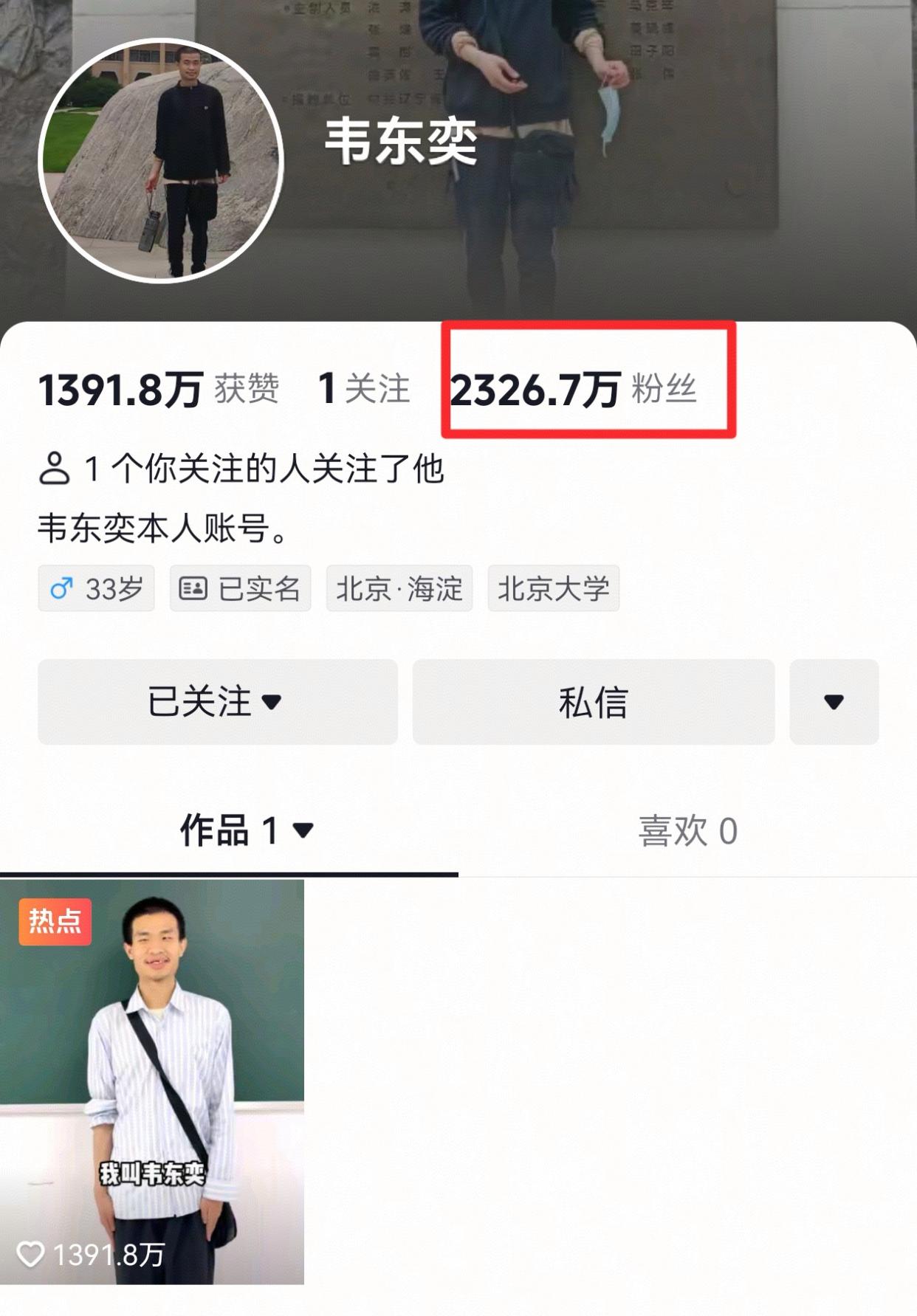 近日,北大数学助理教授韦东奕再次走红网络,在亲戚的助推下,开设了个人社交账号,没想到在短短3天之内,粉丝就暴涨了2000多万,截止到发稿时,韦神的粉丝已经超过2300万。