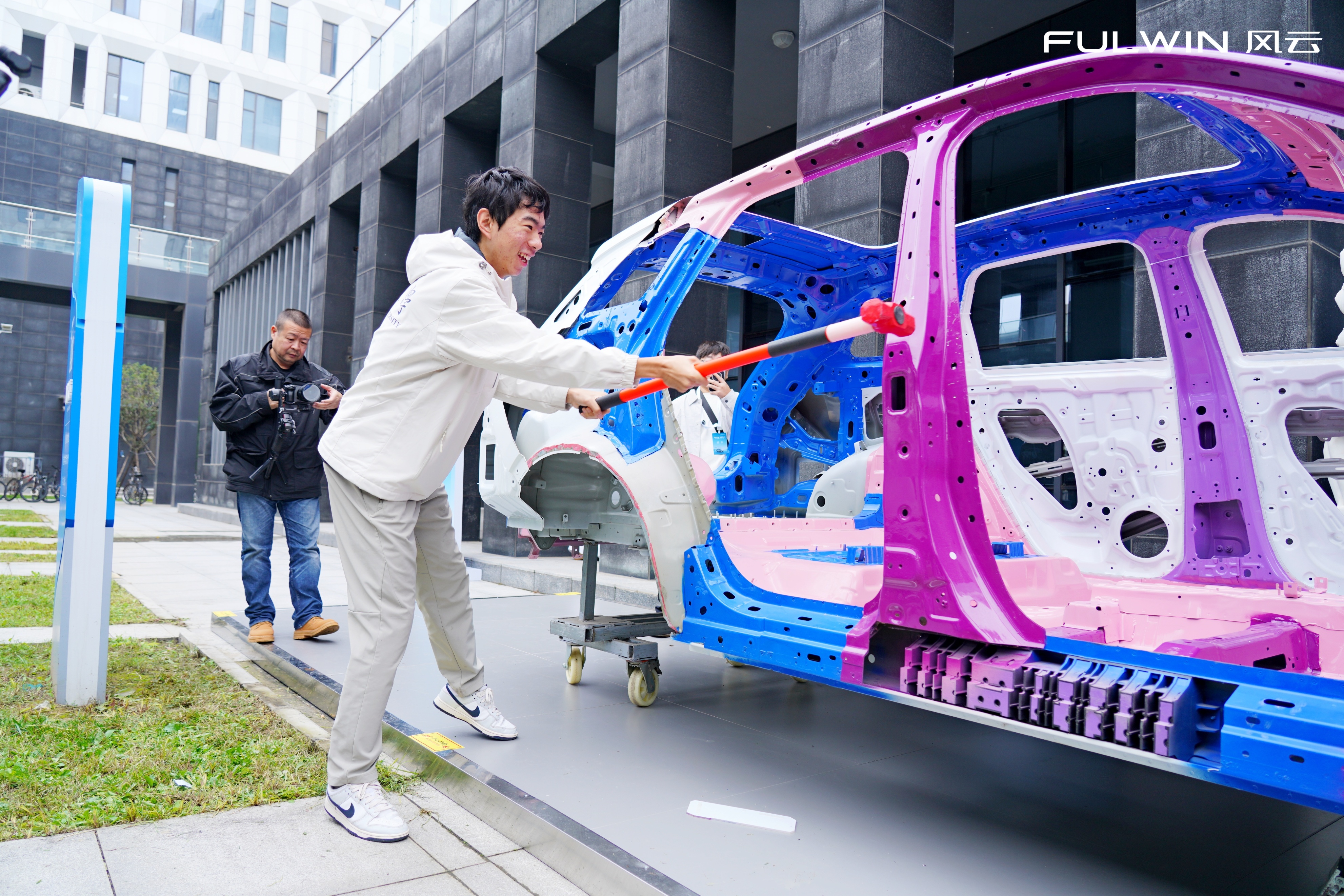在活动现场的超能“抗”互动环节,风云T9白车身经受住了师生们的铁锤电钻考验,直观展现了它的超“钢”硬度和强大抗压性。这一生动演示,让学生们深刻理解到车身钢材强度与结构设计的安全性。