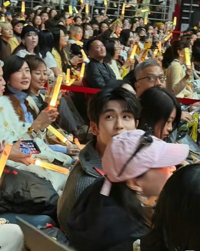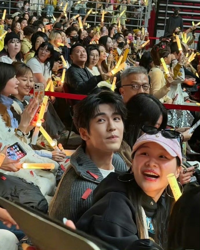 而金靖不愧是气氛组担当,全程高能输出,扎着高马尾蹦蹦跳跳,举着荧光棒合唱差点甩飞帽子,还被张凌赫笑着扶了一把,这“冤种姐弟”的互动甜度超标!更绝的是她突然掏出黄色彩带往镜头前吹,俏皮又会整活,完全是把演唱会当成自己主场的节奏。