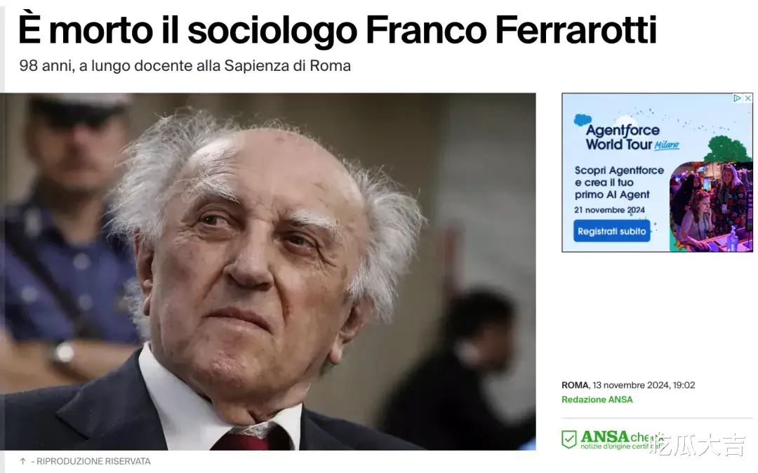 著名社会学家、意大利社会学泰斗、意大利国家科学院院士、罗马大学社会学名誉教授佛朗哥·费拉罗蒂(Franco Ferrarotti)于当地时间11月13日在意大利首都罗马逝世,享年98岁。
