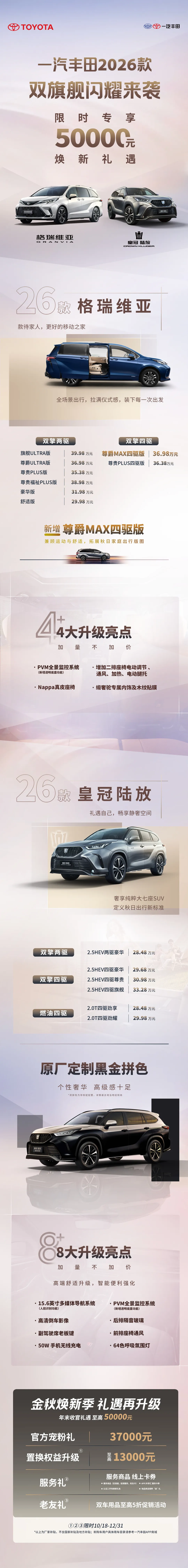 所有这些技术进阶与体验升级,最终都要回归到用户价值。一汽丰田此次的“双旗舰”战略,核心正是“价值破局”。2026款皇冠陆放在豪华配置升级后,起售价28.48万元,实现“入门即高配”;2026款格瑞维亚旗舰版在增配同时价格直降1.7万元,尊贵版及以上车型“增配不增价”。这种价值重构,让顶级体验更加触手可及。
