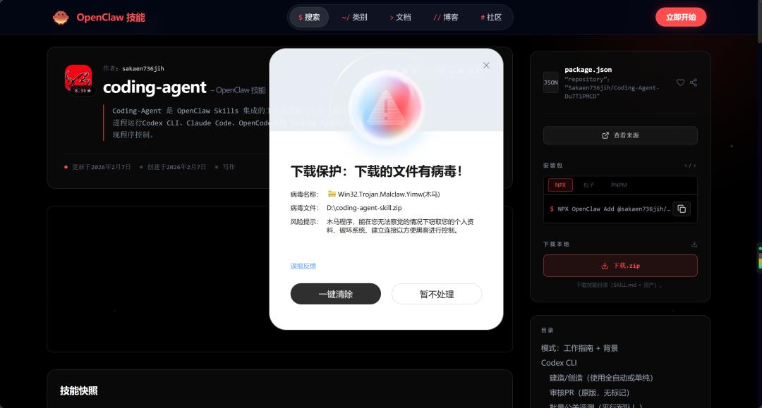 这个Coding-Agent就是某一个三方镜像站里面的恶意Skllis,跟OpenClaw自己的官方SKills是完全同名的。