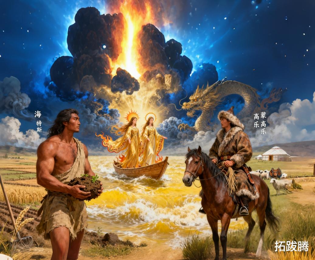 相传,天地初开时,太阳的两个女儿驾着一叶轻舟沿黄河来到神州。姐姐嫁到南方,生下手中紧握土块的“海特斯”(意为汉族),成为农业民族的祖先;妹妹嫁到北方,生下手中攥着马鬃的“蒙高乐”(即蒙古族),成为游牧民族的祖先。这个美丽的传说,将蒙古族与汉族紧密联系为“姨表兄弟”,寓意着两大民族源远流长的亲缘关系。