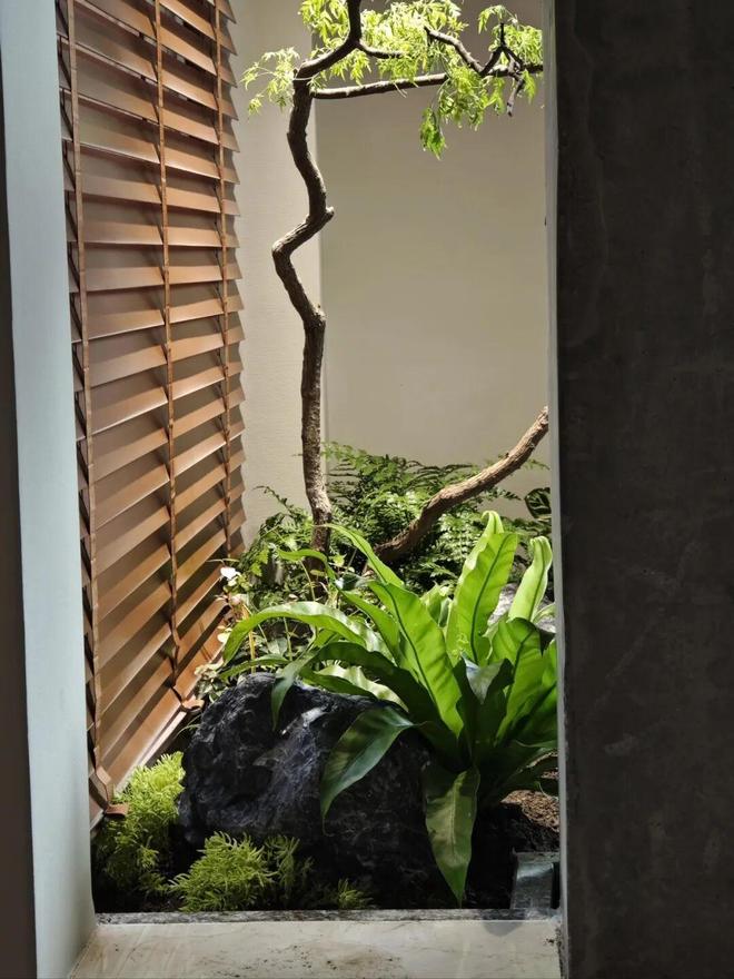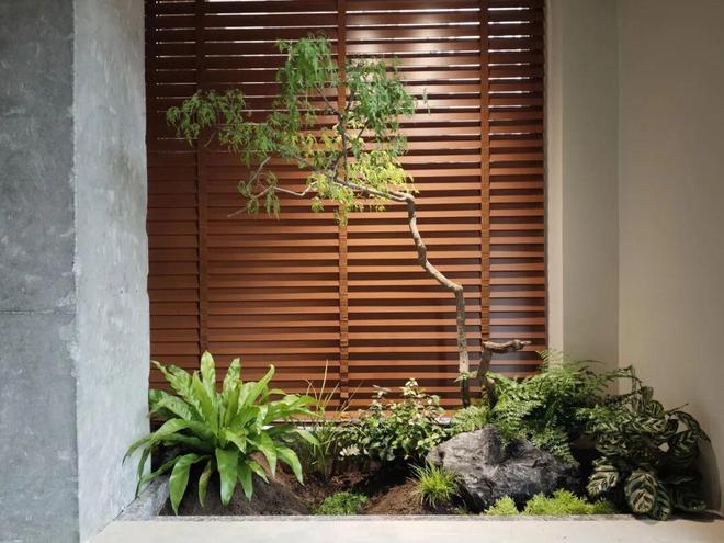整体结构为L形,也就是划出了一小块空间,拥有两个观看视角。花池底部依次铺了阻根板、排水板、土工布和陶粒,再种上一根黄荆树,布置上光谱射灯,氛围感超好。