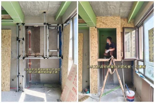 做法上也并不复杂,只需要把格栅封掉,用方管焊出树屋结构,再用木板包起来,最后定制一个楼梯就好。