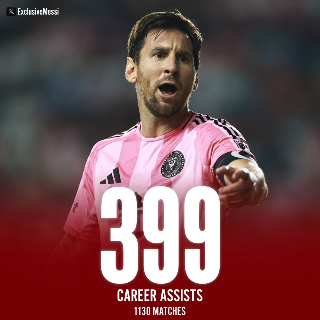 38岁梅西职业生涯助攻数已经提升至399次,距离400助里程碑仅差最后一助。