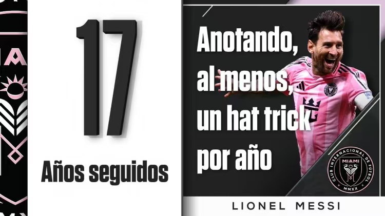 梅西连续17年在比赛中完成帽子戏法,真是20年如一日的巅峰状态。