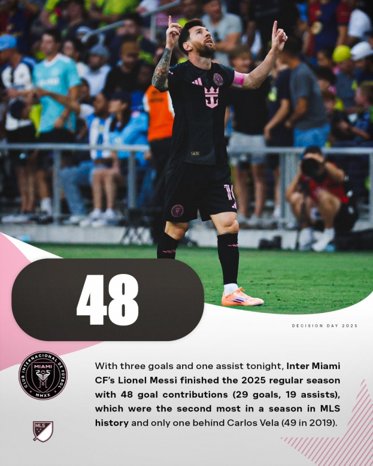 梅西本赛季美职联常规赛参与进球最终数据为28场29球19助,同时领跑美职联常规赛射手榜+助攻榜,能传能射,球王本色。