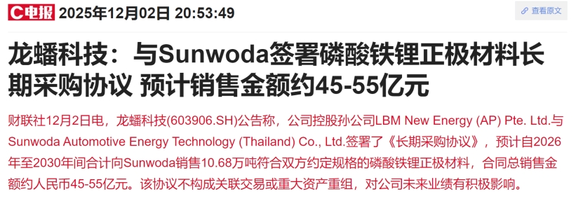 而就在12月2日,龙蟠科技与Sunwoda签署磷酸铁锂正极材料长期采购协议 预计销售金额约45-55亿元。显示出需求呈现爆发的态势。