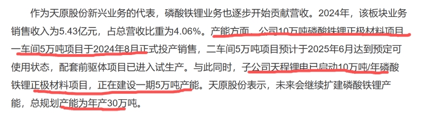 磷酸铁产能:公司10万吨磷酸铁锂产能已经相继投产。子公司天程锂电已启动10万吨/年磷酸铁锂正极材料项目,正在建设一期5万吨产能。并且表示,未来会继续扩建磷酸铁锂产能,总规划产能为年产30万吨。