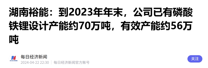 磷酸铁锂产能:公司互动平台上表示,到2023年末,公司磷酸铁锂设计产能约70万吨,有效产能约56万吨。2024年,公司磷酸盐正极材料出货量达71.06万吨,连续五年位居行业第一。随着磷酸铁锂进入涨价周期,公司股价与业绩有望迎来戴维斯双击。