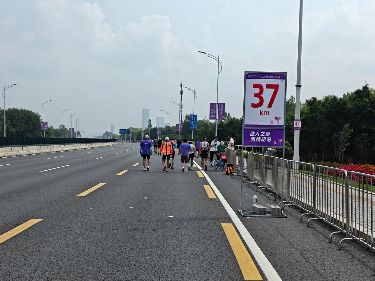 ▲33公里,回到滨水大道上,这也是我们之前跟全马比较快选手在赛道上遇见的地方。