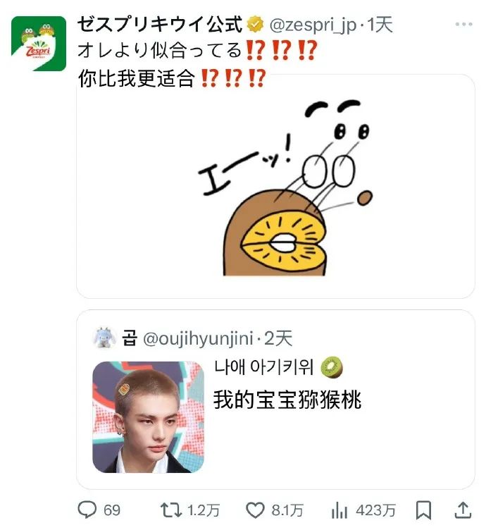 此外,粉丝们内部也在玩梗,为剃了寸头后的黄铉辰p上了猕猴桃的贴纸,还吸引了官方账号转发,结果今天铉辰亲自变成了猕猴桃。官方玩梗,最为致命,黄铉辰真的太有趣了。