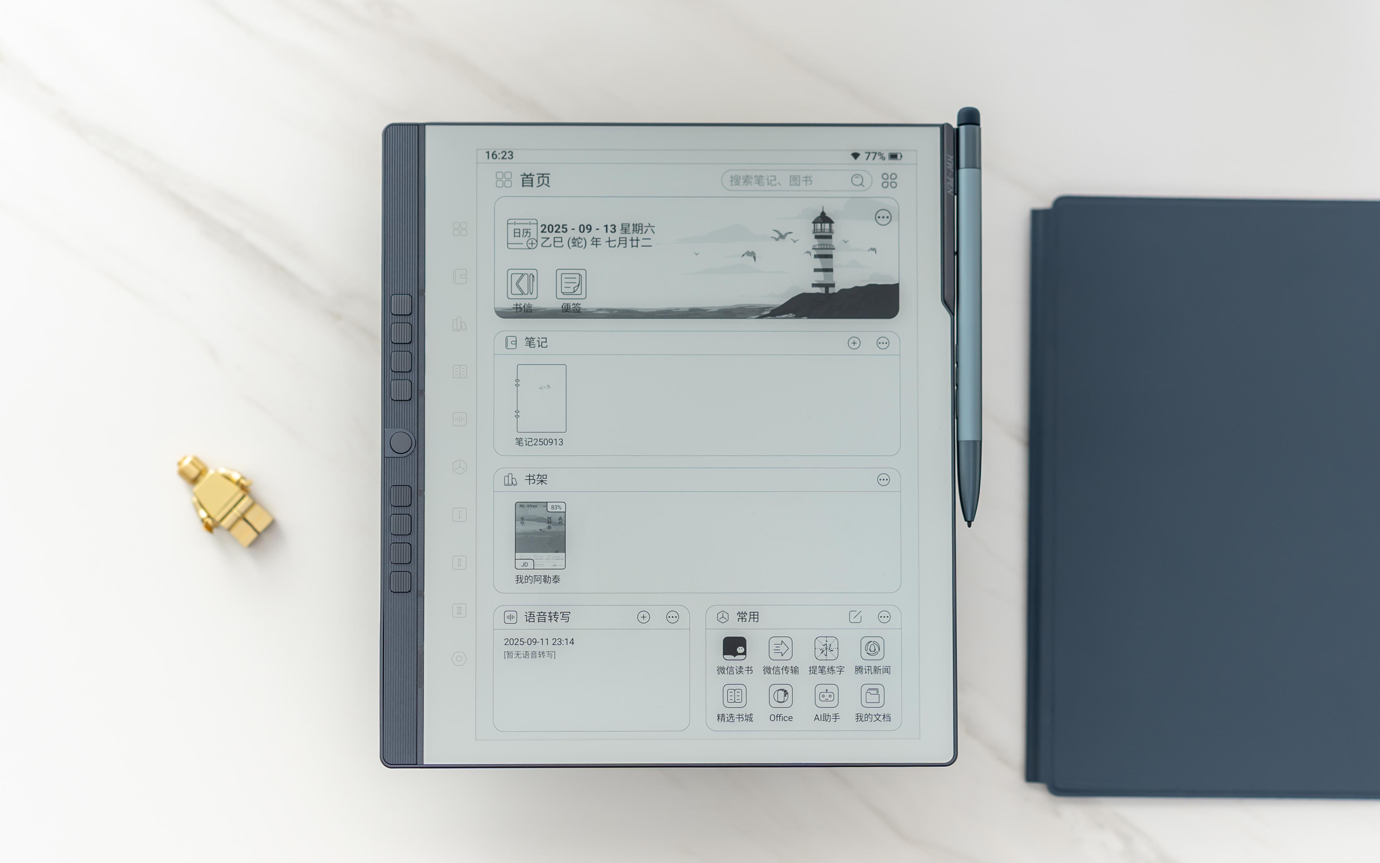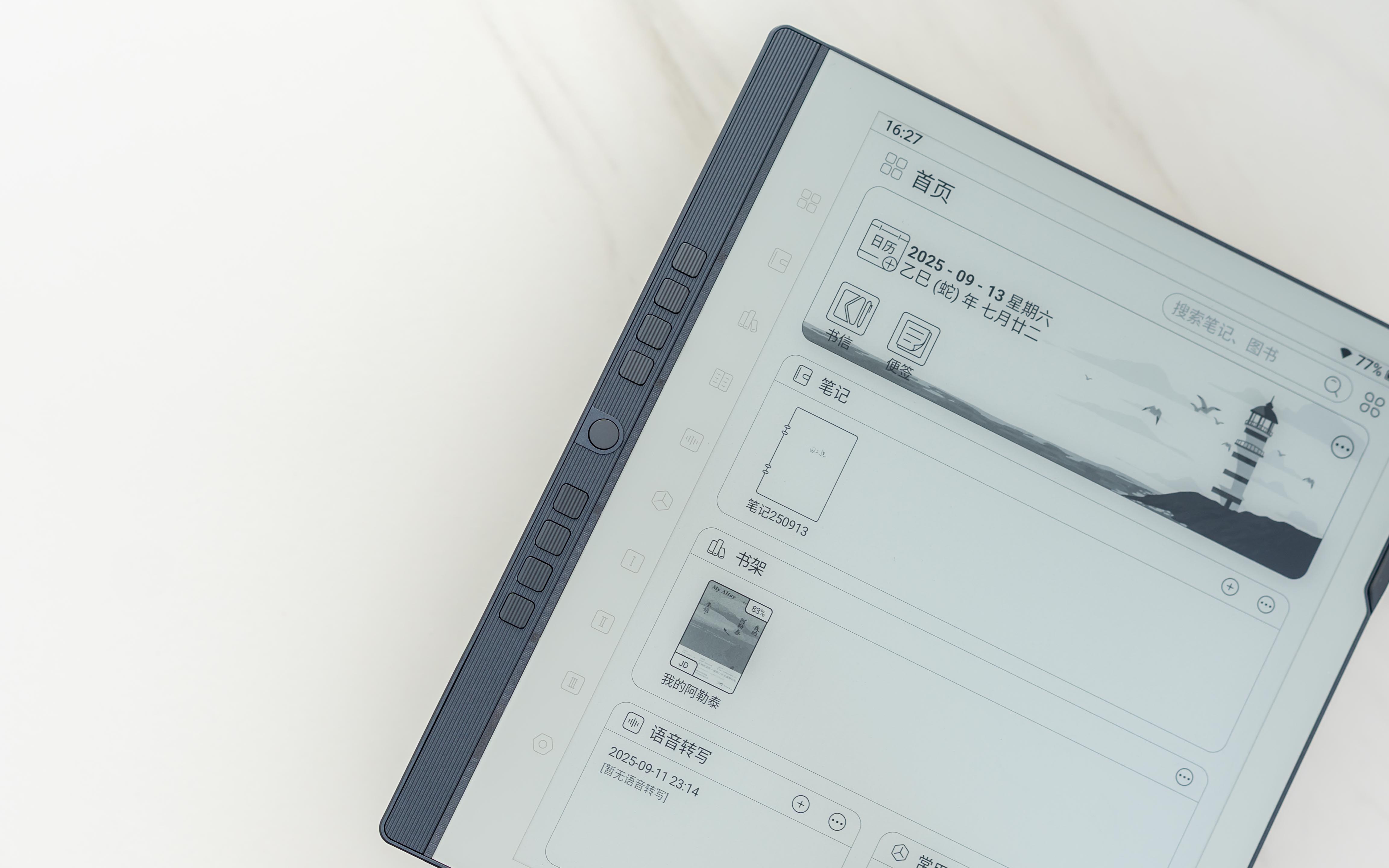 开机后,首页界面简洁明了,从笔记、阅读、语音转写和常用 APP全部包含,配合 9 枚实体按键+灵动条组合,即使新手用户也可以快速上手。