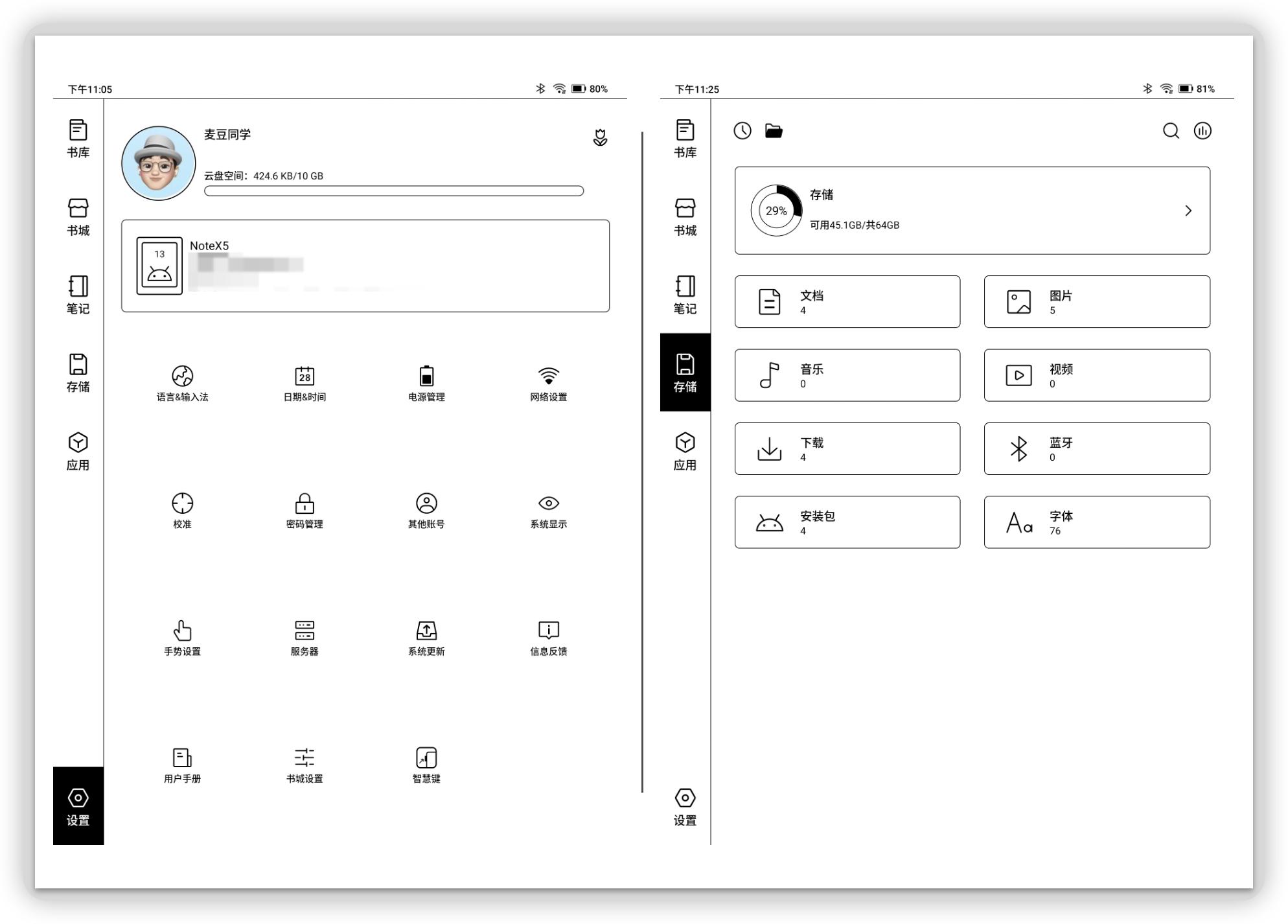 不过,Note X5在APP支持上优势明显——支持无数量限制的第三方APP安装,且文石针对电纸书特性,优化了150+种APP,数量在同类产品中处于较高水平,用户可根据需求自由拓展功能,可玩性更高。
