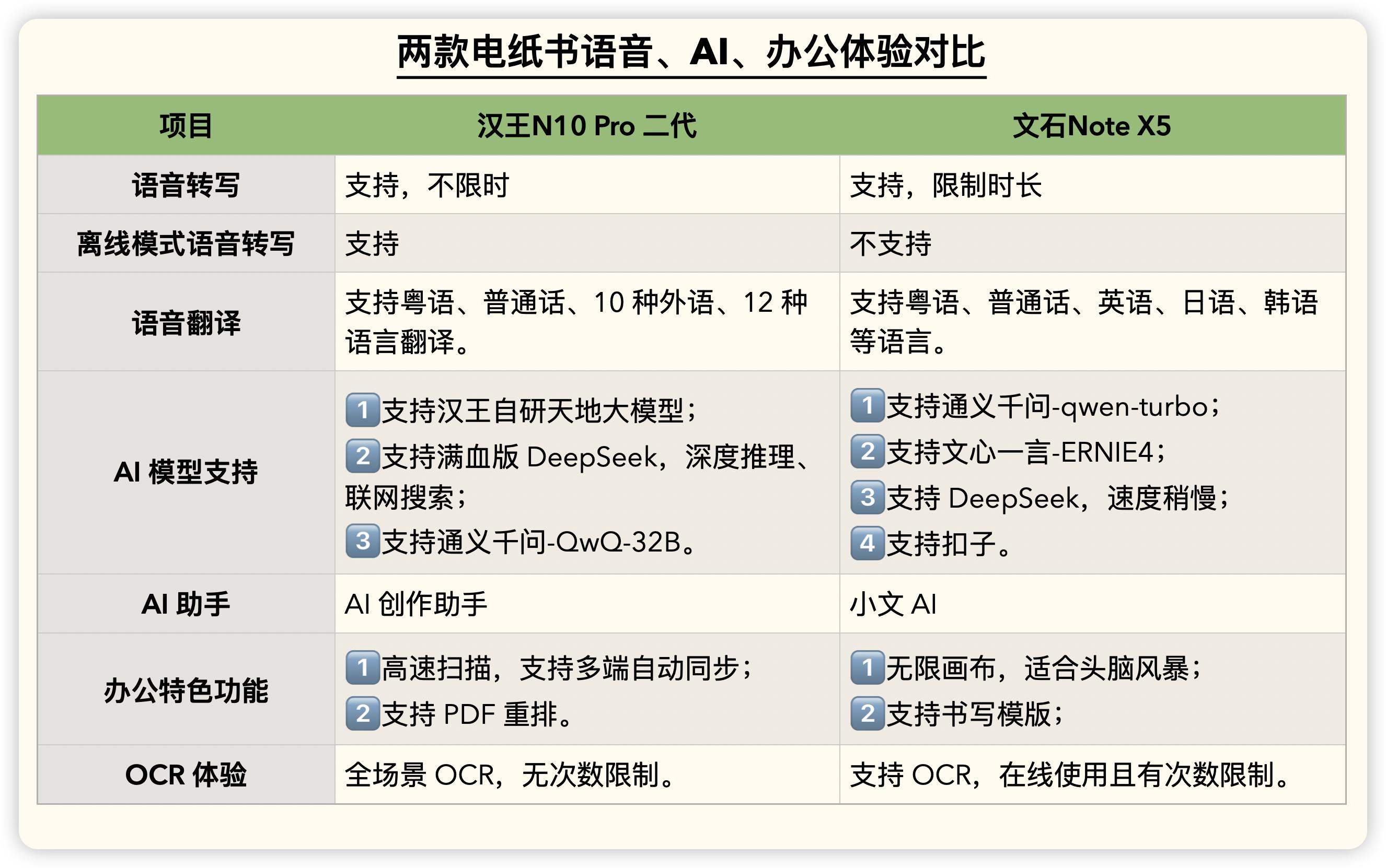 办公体验对比日常办公中,最令人头疼的便是会议记录和整理,一方面涉及内容多而杂,需要逐字听清整理,另一方面有时效性,这就要求你必须在规定时间内完成。汉王N10 Pro 二代和文石 Note X5在这方面都作了加强,先来看看整体对比,如下图所示。