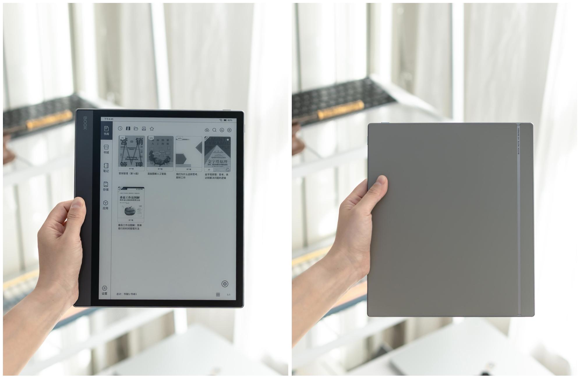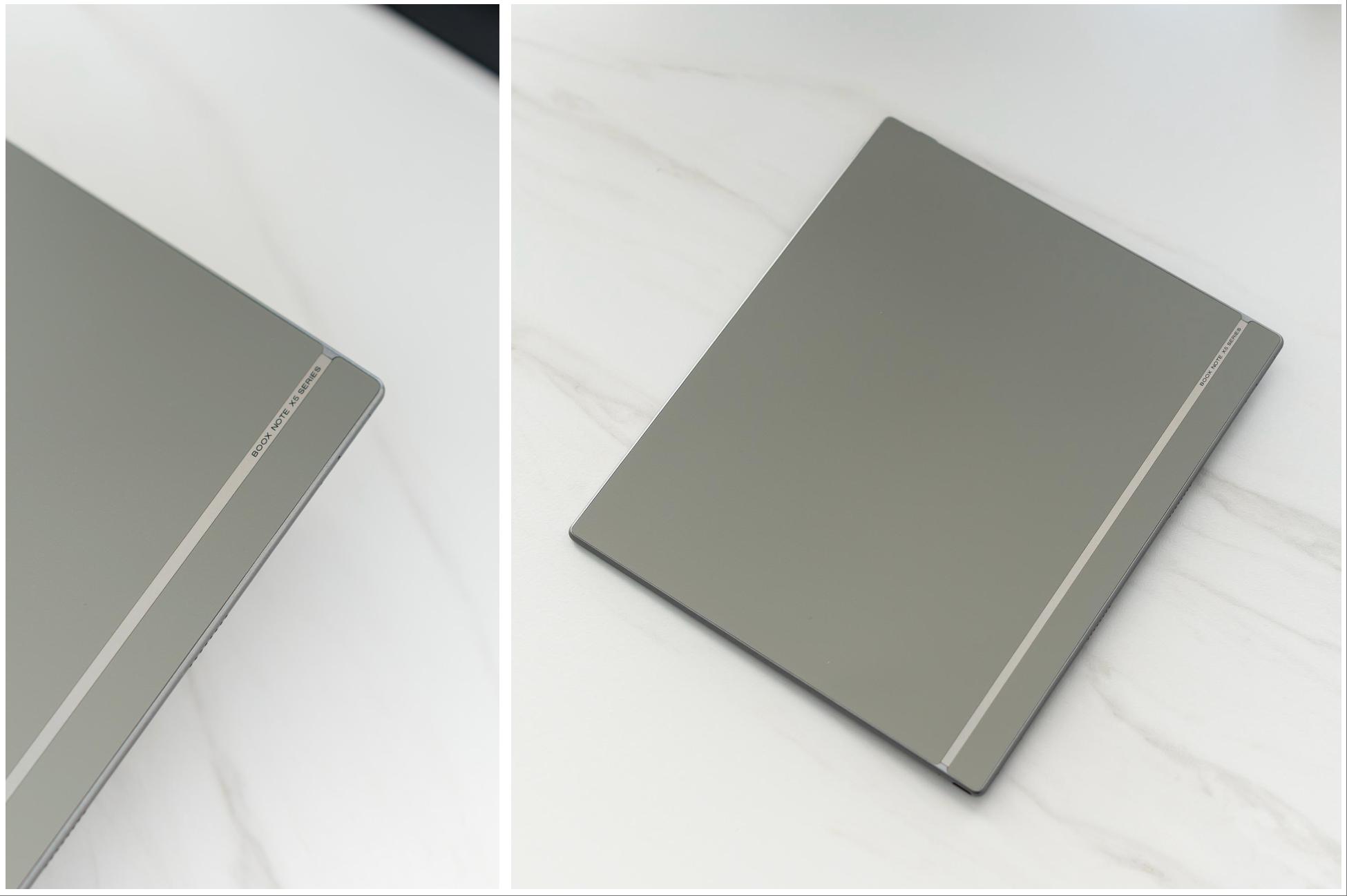 文石Note X5:相较于前代,Note X5重量有所减轻;背面素皮材质搭配四周圆滑过渡,手感很细腻,机身重心分布均匀,单手握持感受较前代有明显提升,握持稳定性良好。