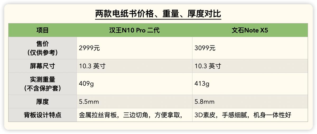 外观设计:文石Note X5>汉王N10 Pro 二代。文石Note X5机身一体性更强,浅色素皮材质颜值出众,更符合当下审美;汉王N10 Pro二代则胜在配件齐全,且笔挂设计更实用。