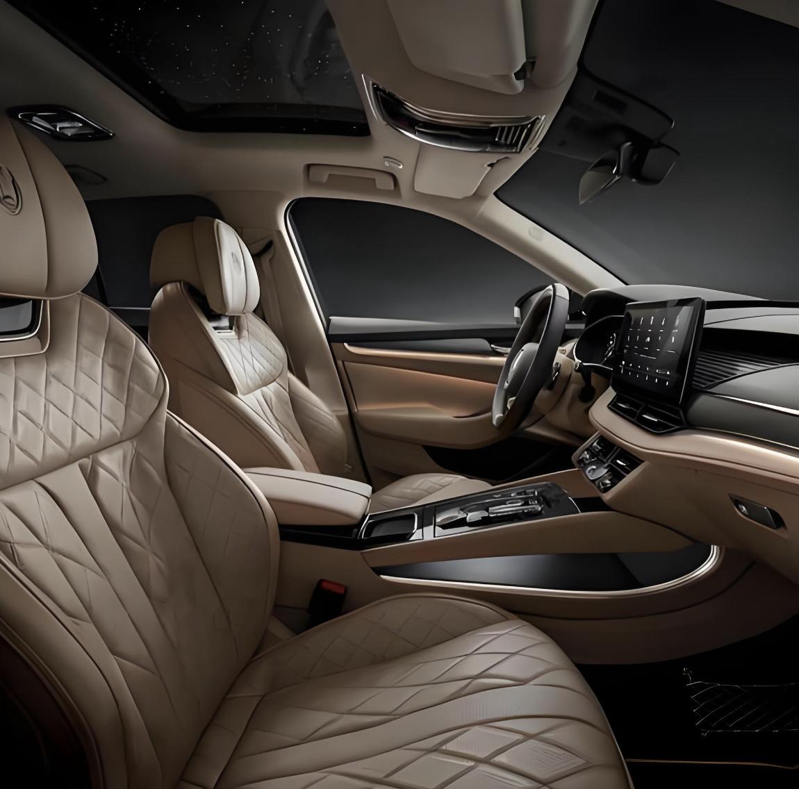 新一代斯柯达速派采用了浅棕色为主的色调搭配,大面积雾面磨砂材质的包裹,再加上亮黑色钢琴烤漆装饰面板以及实木材质的饰板点缀,还加入了红色的双缝线工艺,还有红色的安全带,带来了柔软细腻的质感,上乘的工艺也营造出更多的高级感。中控台配备了经典的三辐式多功能方向盘,两侧加入了换挡拨片,操控岛区域保留了传统的换挡手柄,还有炮筒式空调出风口,给人一种行政级豪华轿车的氛围感,也不缺乏运动气息。中控台升级了11.9英寸液晶仪表+14.5英寸中控屏共同组成的曲面一体屏,副驾前将配备10.9英寸娱乐屏。
