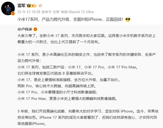 “小米17系列,产品力跨代升级,全面对标iPhone,正面迎战!”小米创办人雷军在微博上的这番宣言,瞬间点燃科技圈。