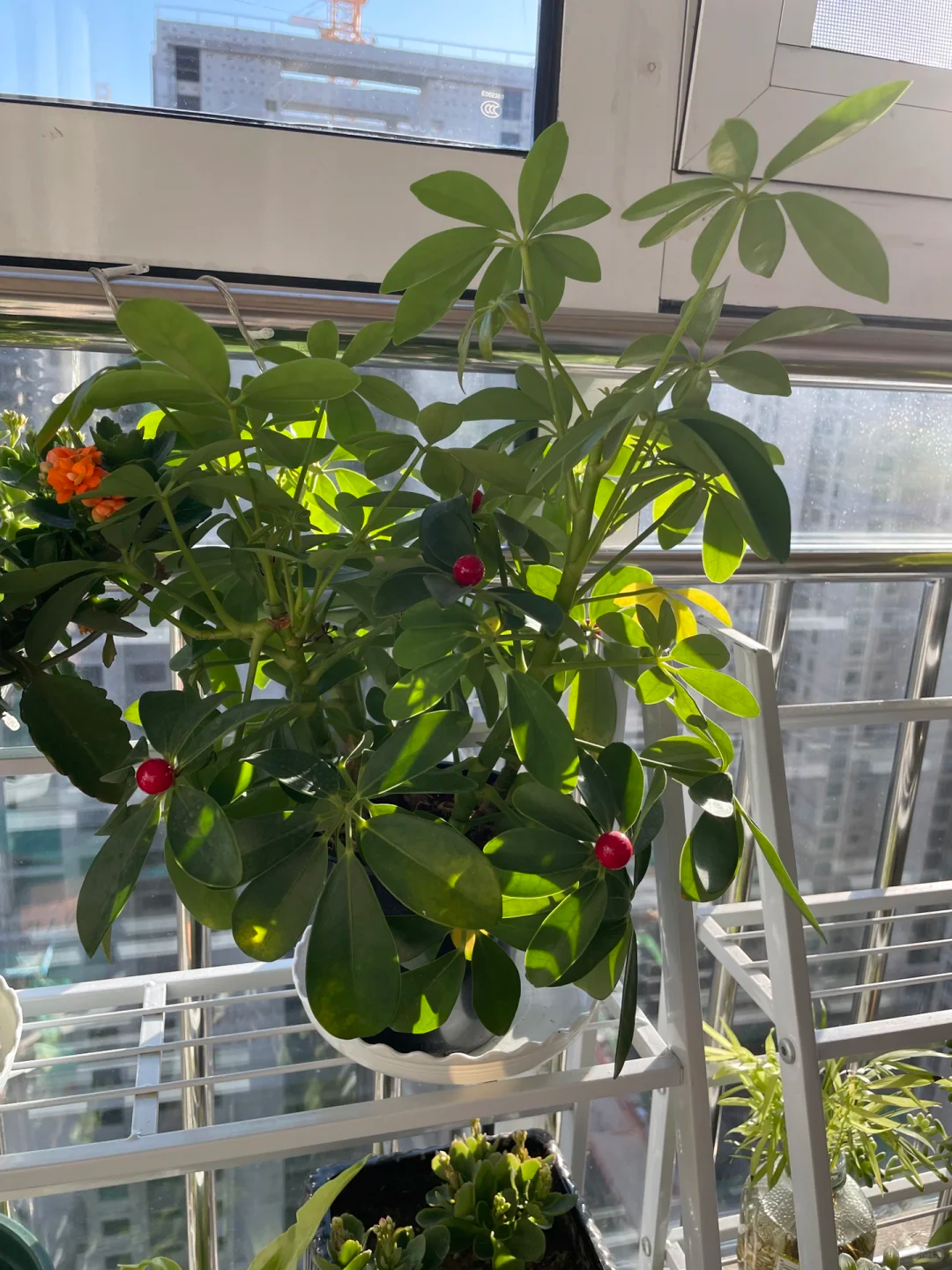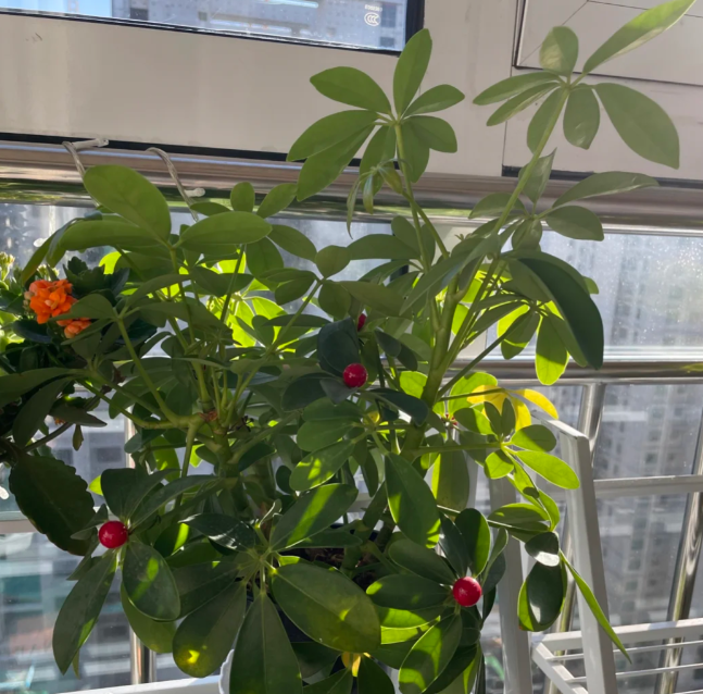 --看到图片,刚被种草,结果用手机扫一扫,才发现它是常见的鸭掌木,不得不说,挂上红果果,颜值确实提升一大截。