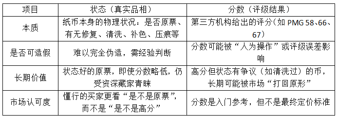 国际评级机构如PMG将纸币分为170分,58分以上才有较高收藏价值,65分以上为优质品。