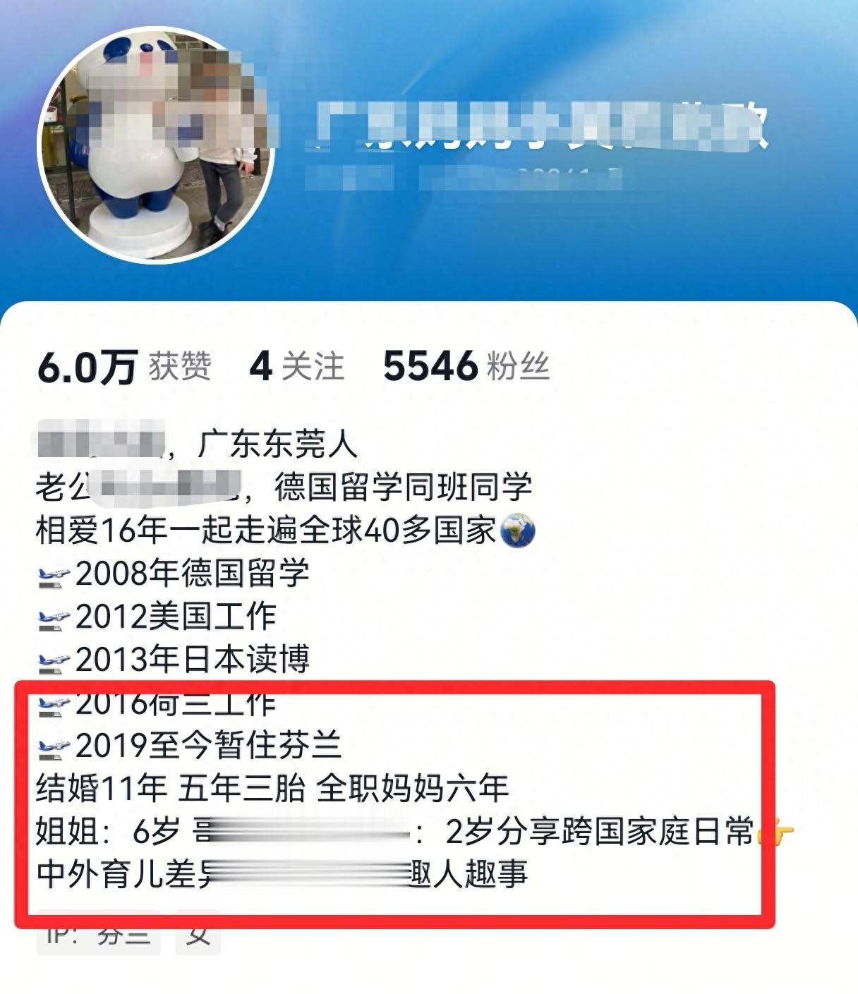看了一下这位博主的主页介绍,她是广东东莞人,后来嫁给了德国留学同伴同学,结婚11年生了3个小孩。博主去过很多个国家,德国、美国、日本、荷兰,19年到至今住在芬兰。