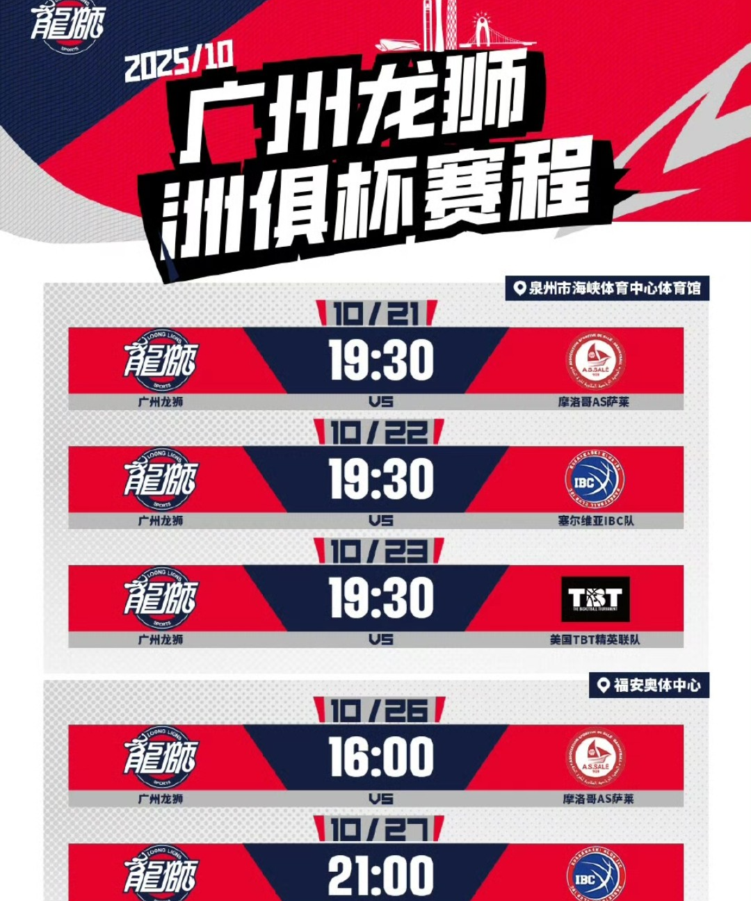 这五场比赛分为两站,10月21日开始的泉州站有三个对手,分别是10月21日19:30,对阵摩洛哥AS萨莱,10月22日19:30,对阵塞尔维亚IBC队,10月23日19:30,对阵美国TBT精英联队。10月26日开始的福安站,10月26日16:00,对阵摩洛哥AS萨莱,10月27日21:00,对阵 塞尔维亚IBC队。对手就是这三支球队,就是翻过来覆过去的打,借着这一波热身赛,也可以检验一下广州男篮这次NBA之旅的收获。