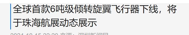 信息来源登载于:深圳新闻网 2024年10月15日 关于“全球首款6吨级倾转旋翼飞行器下线,将于珠海航展动态展示”的报道
