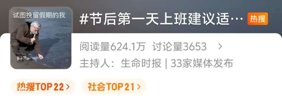 福建疾控中心通过数据指出,类似“摸鱼”的缓冲行为能让节后疲劳感降低35%。工作时忙里偷会儿闲,让脑子放松一下,接下来才能更高效工作。在效率高的时候工作,效率低的时候休息,是良性的工作方法。心理学家也建议,如果觉得上班时间过得太慢,就尝试改变固有的行为方式,如选择另一条路线上下班、提前一站下车步行去办公室或回家,让记忆多增加一些新事物。
