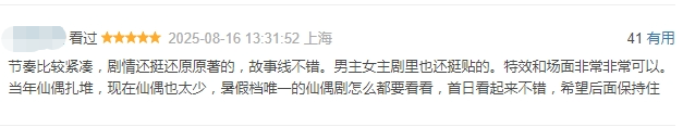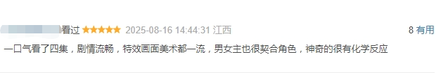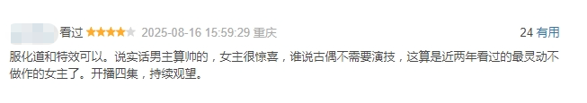 有网友称赞节奏紧凑,服化道与特效都不错,女主灵动,男主人设新颖,演员都很贴合角色,且化学反应很不错。