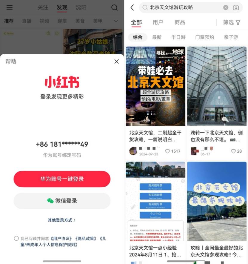 首先,提前做攻略的时候,鸿蒙版小红书特别实用。它可以用华为账号一键登录,省去了输入验证码的繁琐。登录后,直接搜索北京天文馆攻略,可以看到有人已经把怎么去、看什么、怎么看安排得明明白白,照着“抄作业”就行了。跟老公讨论行程的时候,用了鸿蒙5的“碰一碰分享”,将两台鸿蒙5手机头对头一碰,种草的小红书笔记“唰”就分享过去了。看了几个帖子,我们很快就定下了行程。