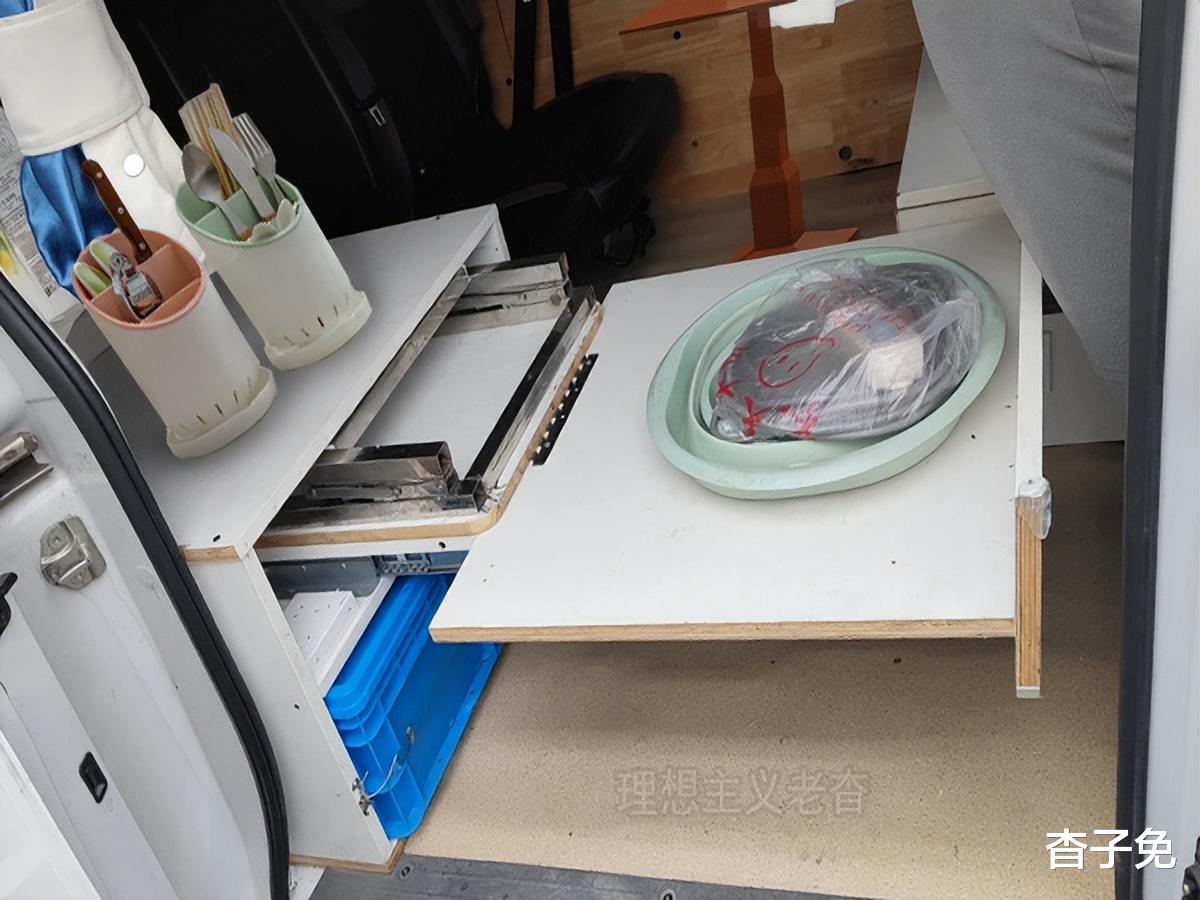 打开中门,门口就是微厨区,下面有炊具,上部是抽拉式台灶,厨台上有餐具,带上食材就可以停车做饭,门口位置也便于散烟。