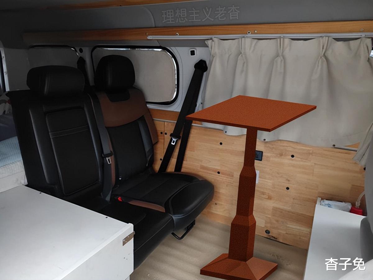 室内木板砌墙打底,中排座椅前面添置了一张棕色升降桌,是日常喝茶吃饭与学习办公的地方。