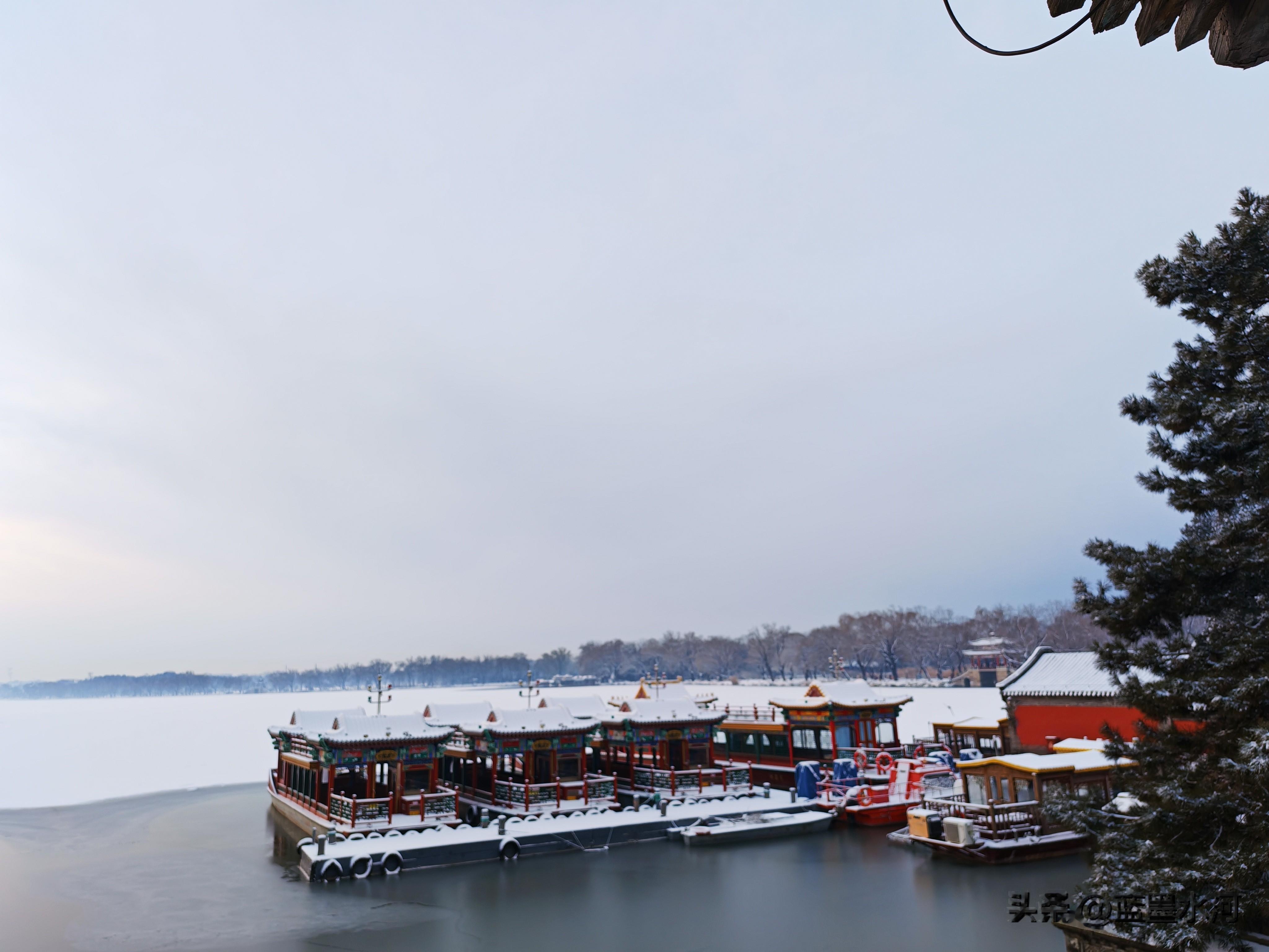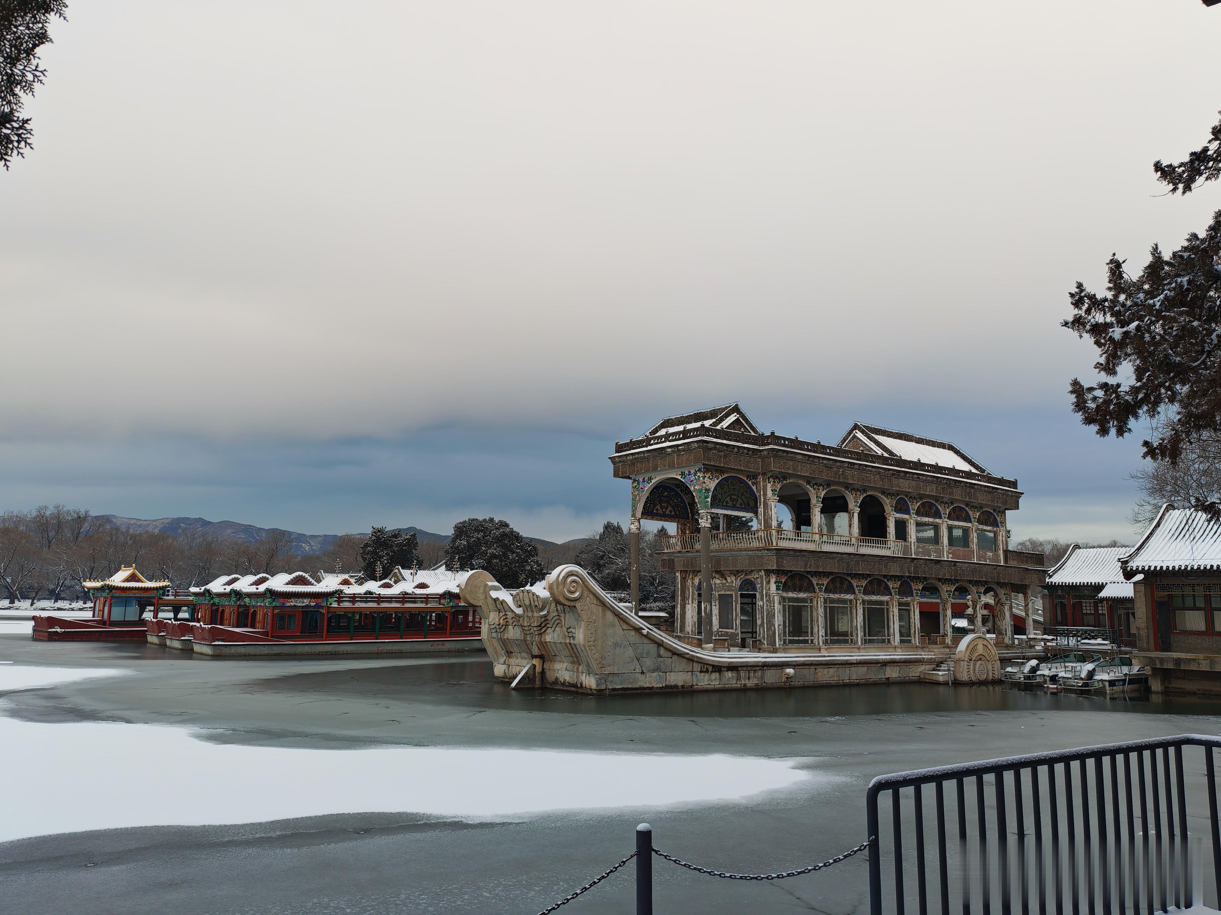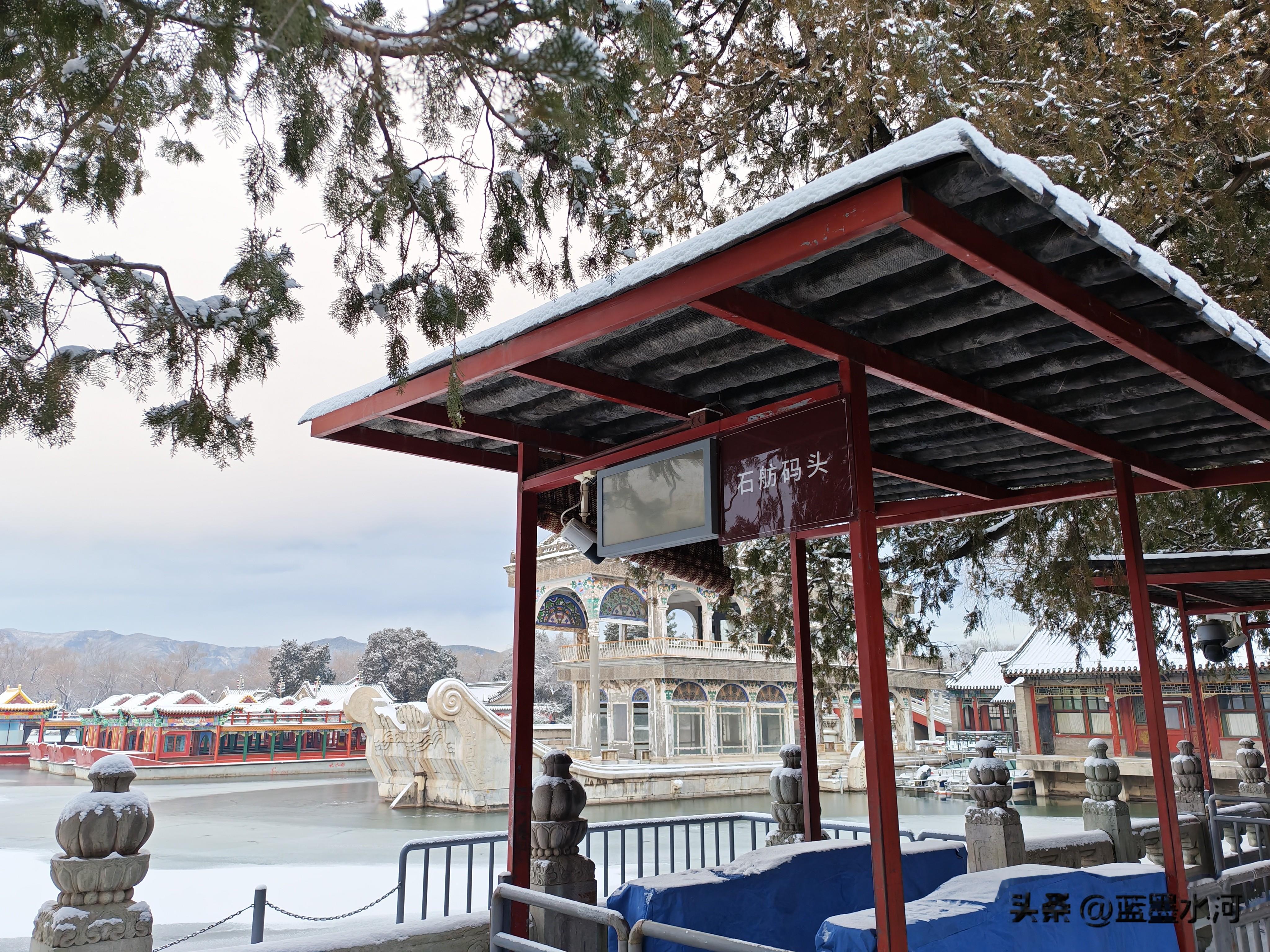 过了荇桥,来到石舫马头,大雪覆石舫马头,琼妆玉砌,一棹烟波笼雪影,尽揽皇家苑囿冬日清宁。