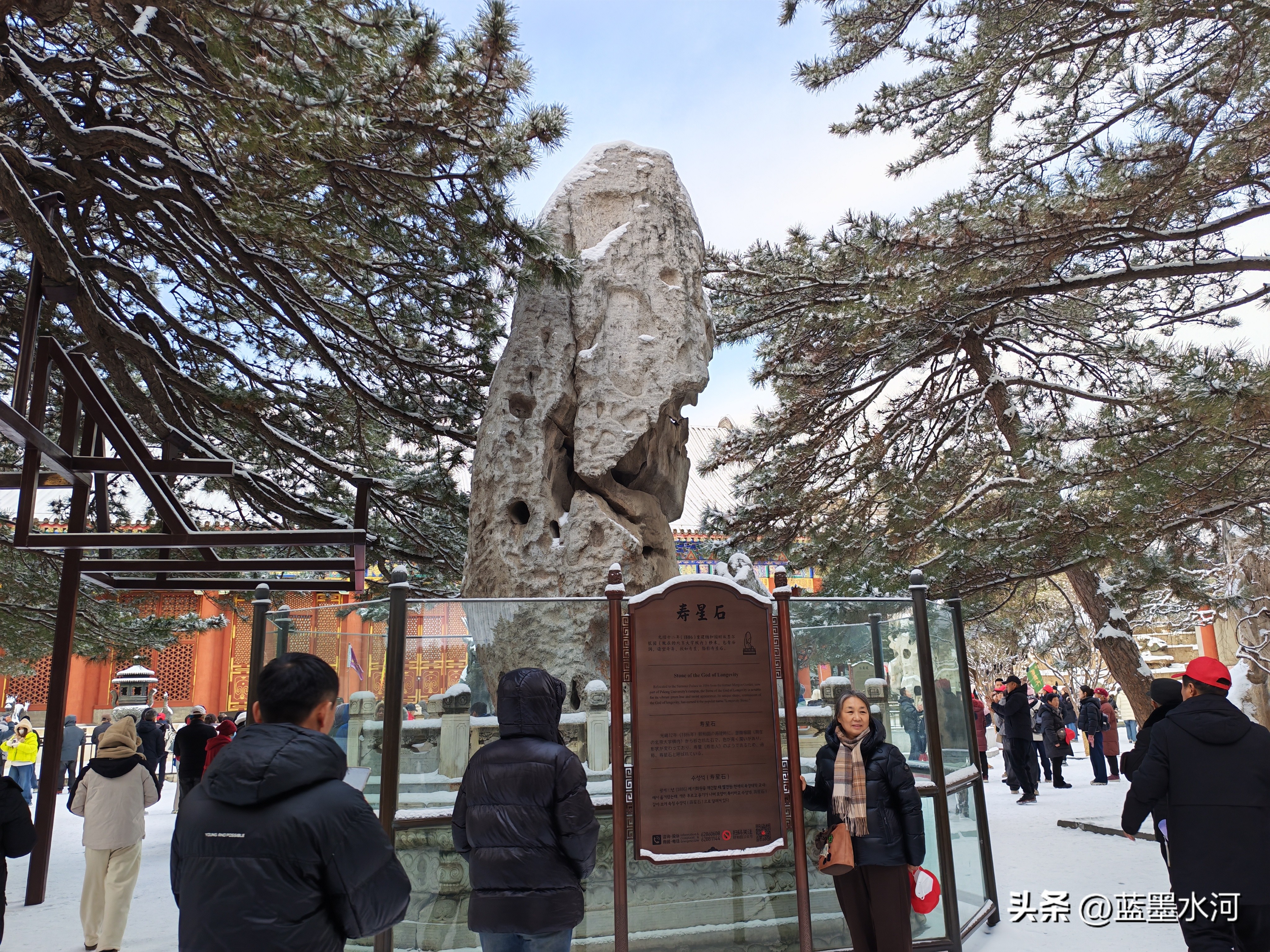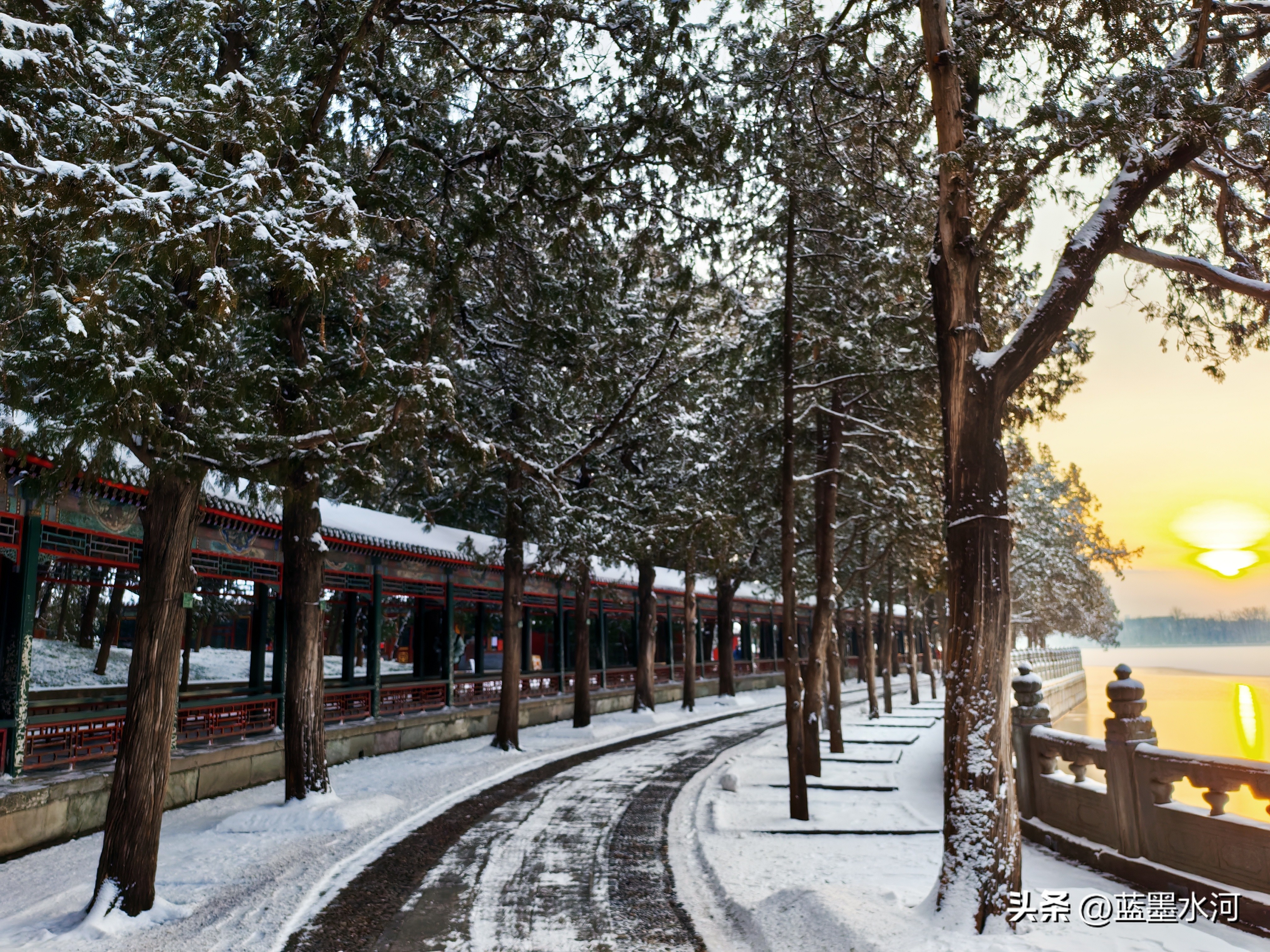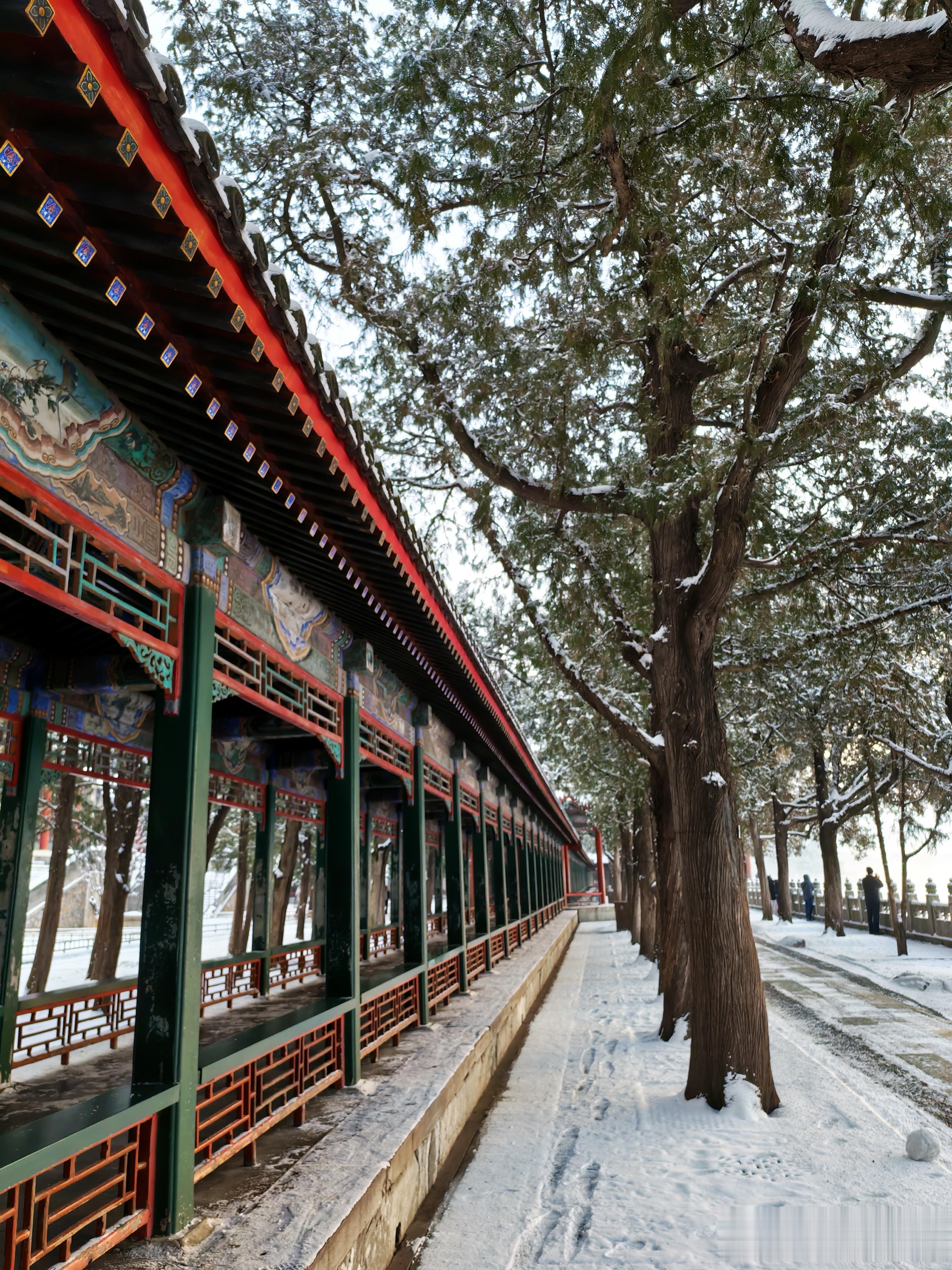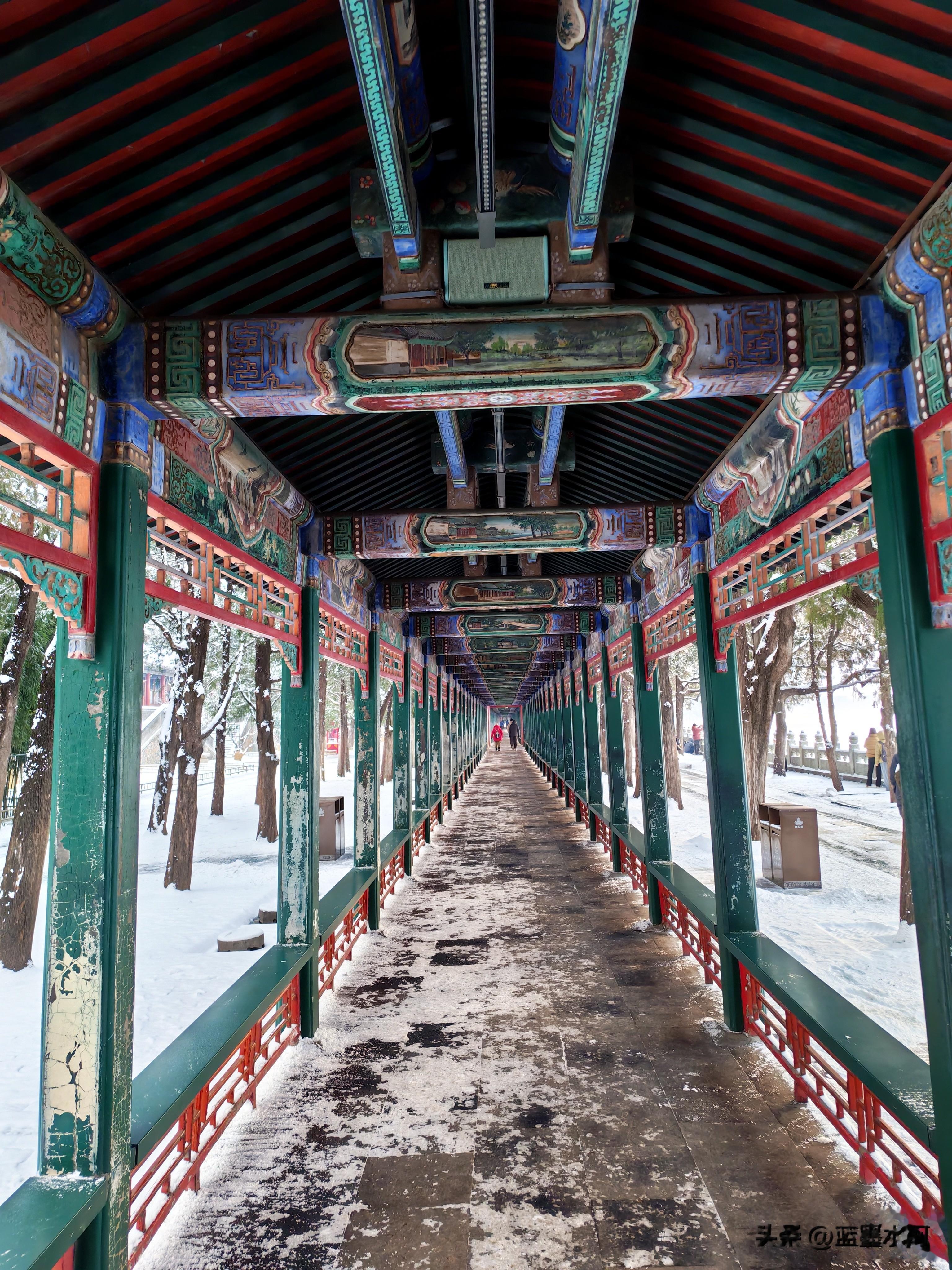 走到这里,旭日东升,游人渐渐多起来了,游览情绪也高涨,看到书画长廊,如一条玉色丝带蜿蜒湖畔。朱红廊柱裹素纱,鎏金飞檐覆琼英,梁间彩画在白雪映衬下愈显鲜活。凭栏远望,万寿山银装素裹,昆明湖冰镜如磨,一步一景皆入画,尽藏皇家园林冬日的清绝与雅致。