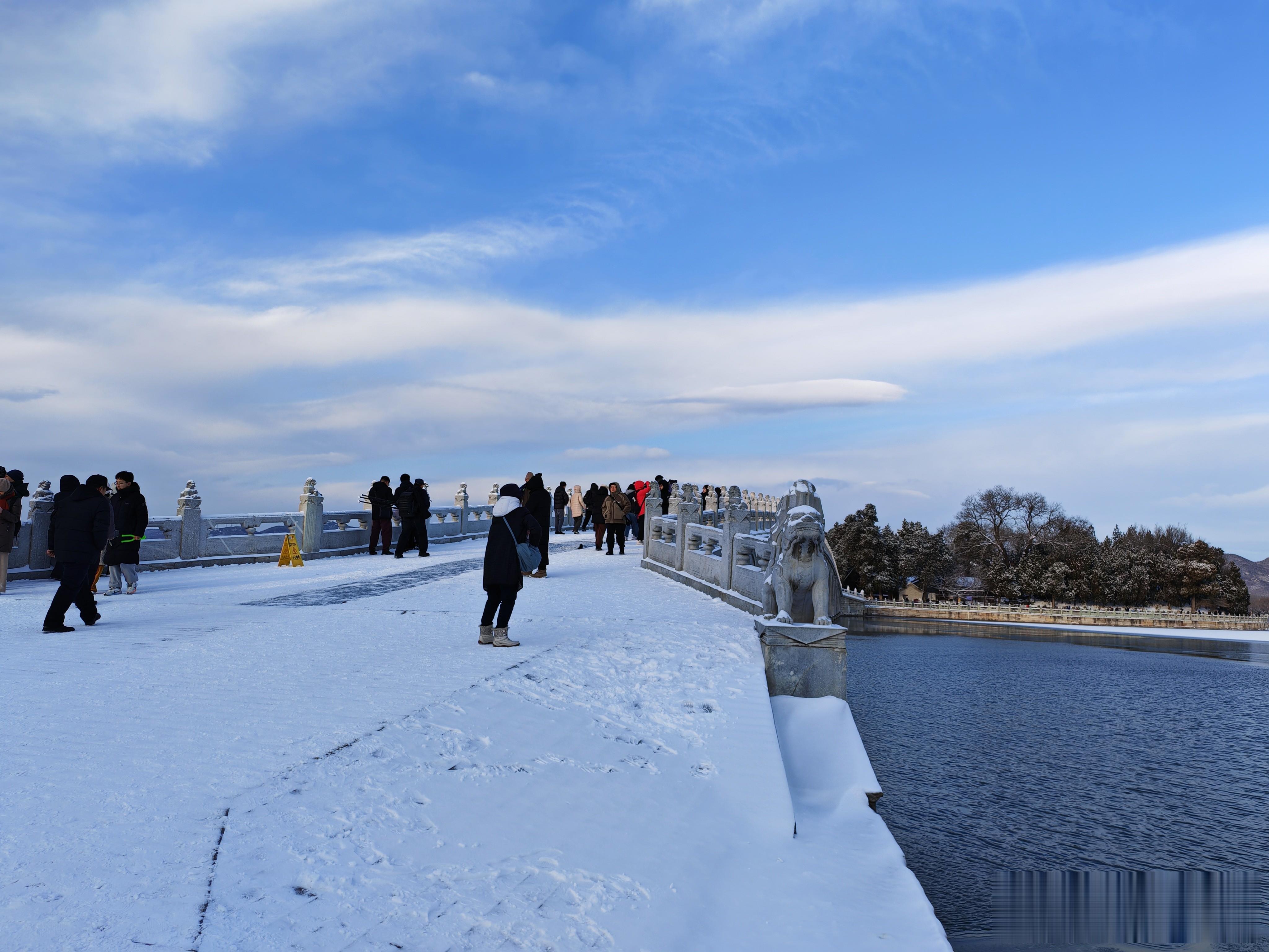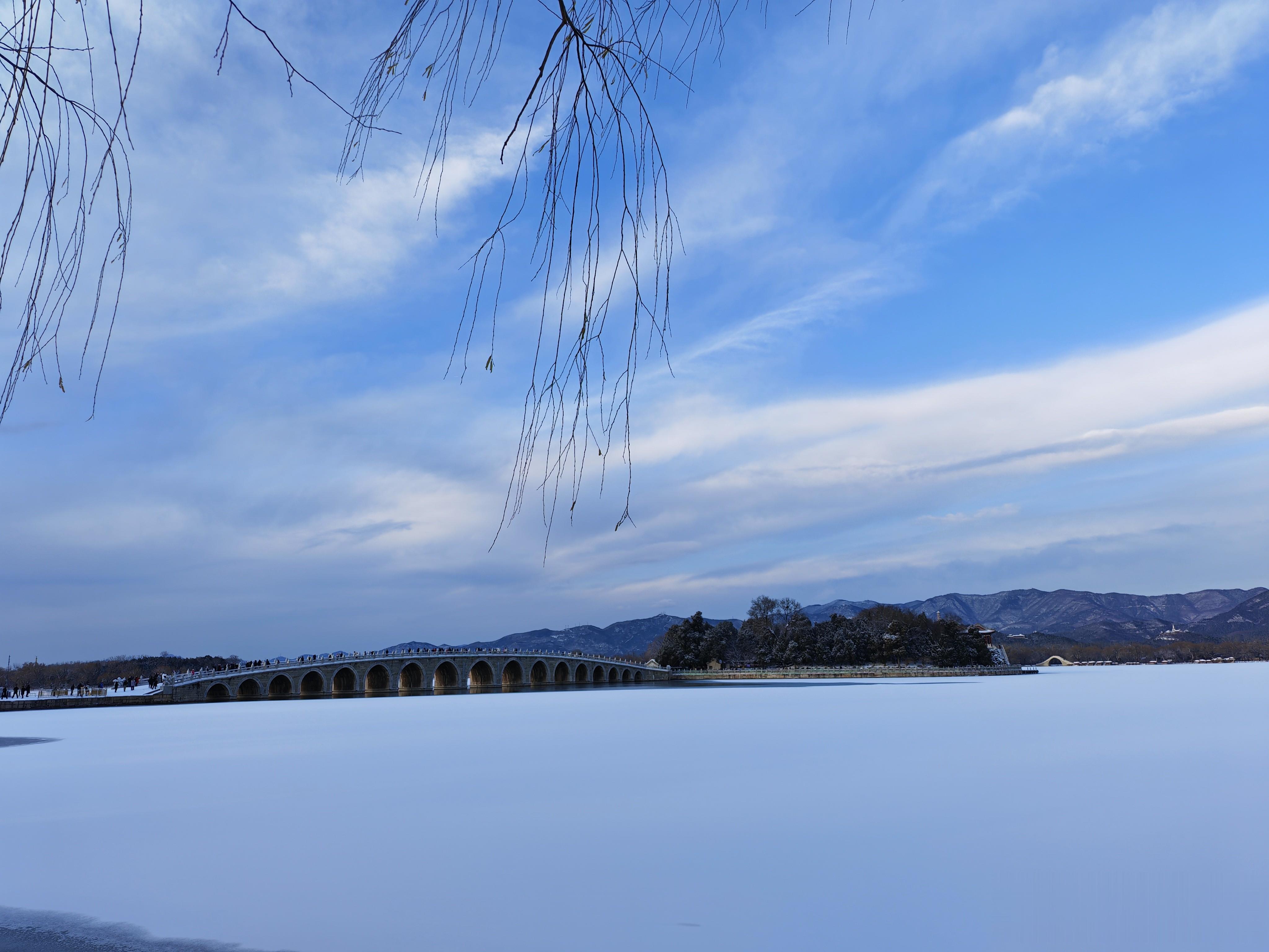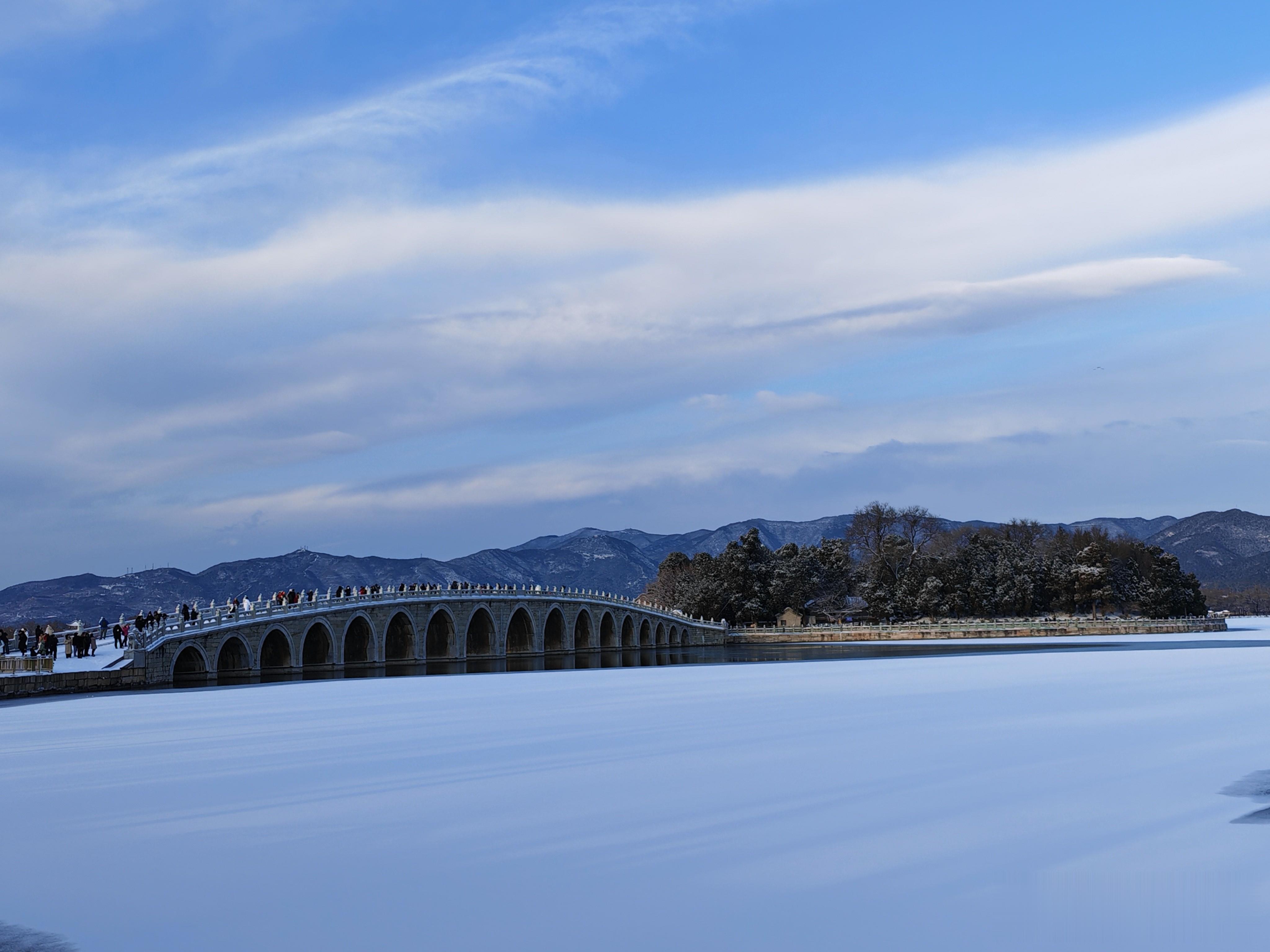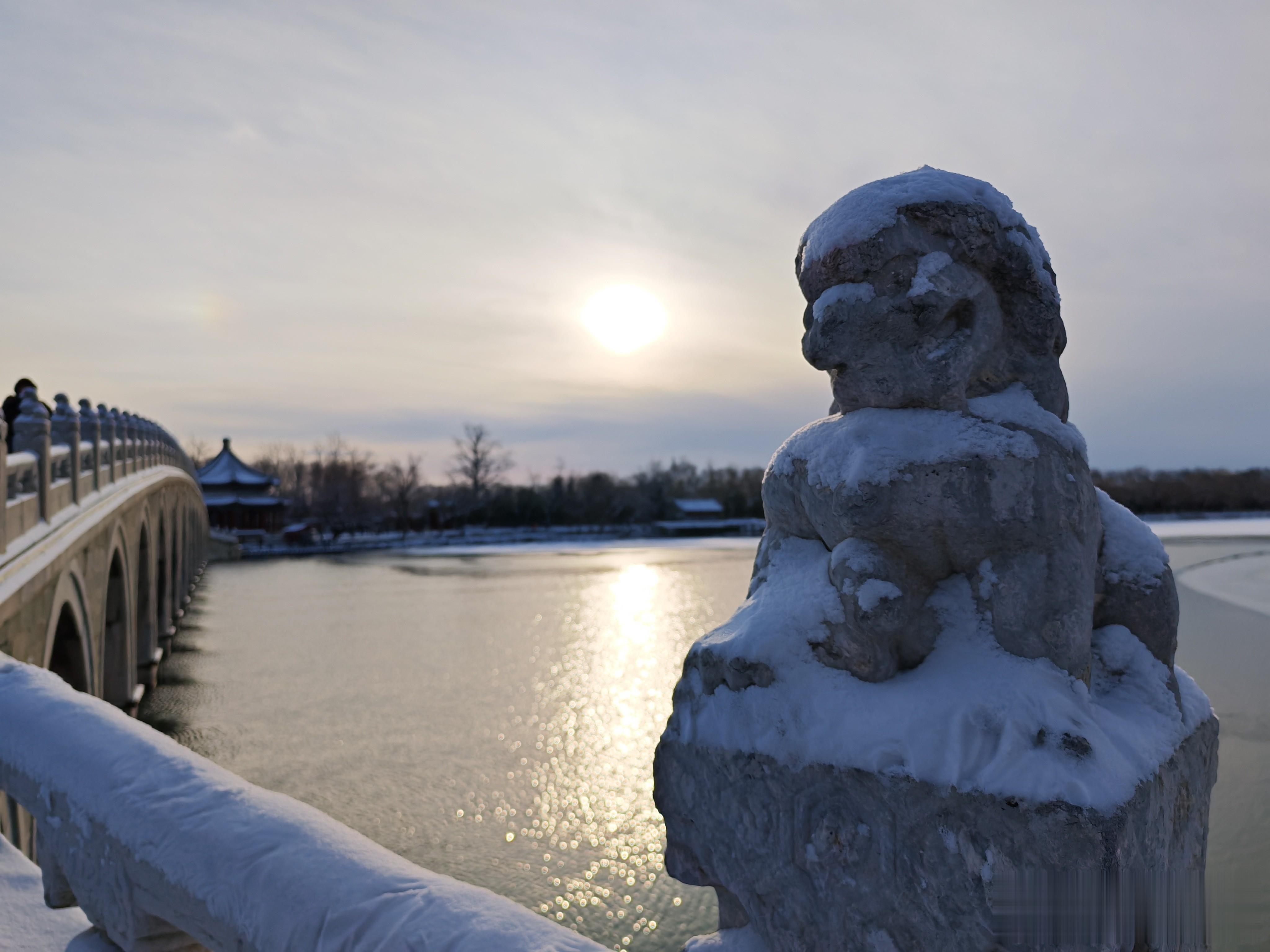 十七孔桥,是游人打卡的必去之地。雪后初霁,十七孔桥如长虹卧波,横亘昆明湖上。桥栏石狮披霜戴雪,千姿百态;桥洞连缀,波光穿隙,与湖心岛相映成趣,尽显皇家园林的雄浑与精巧,藏尽冬日颐和的万千风华。