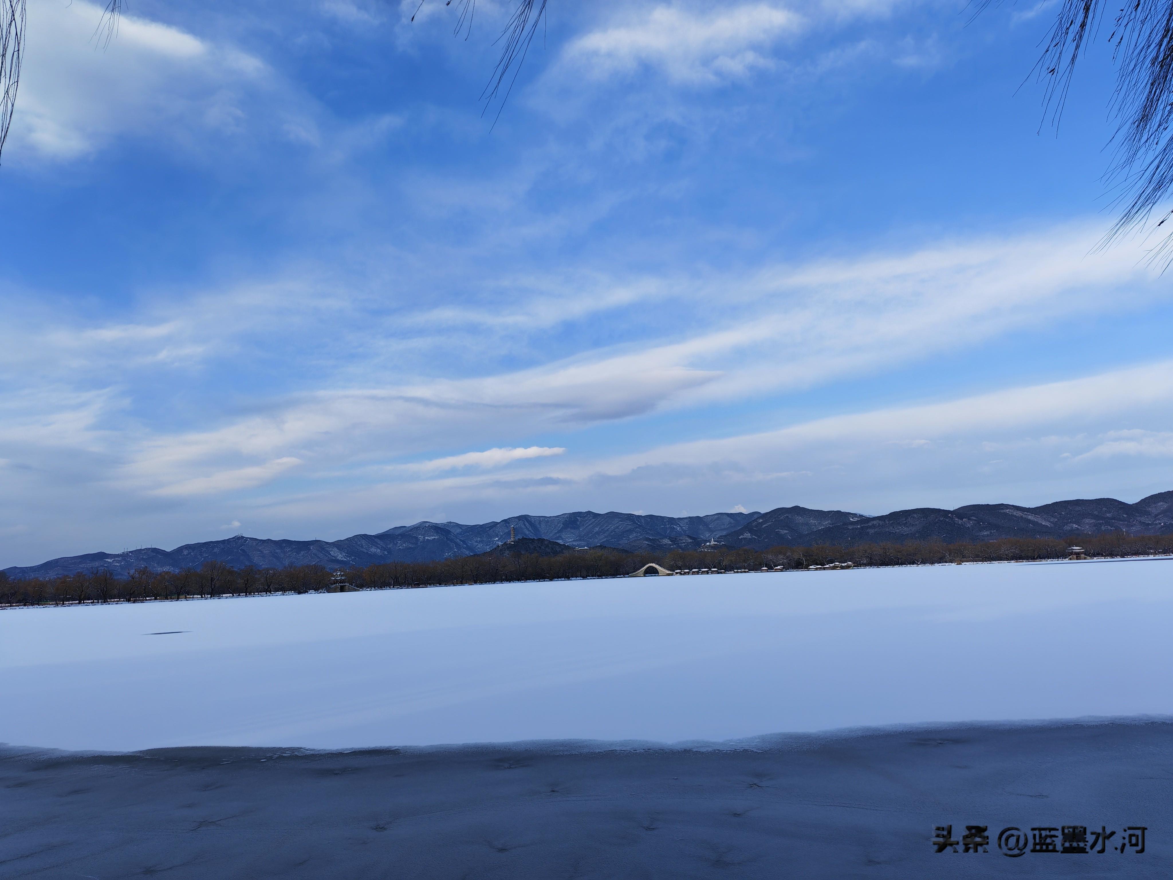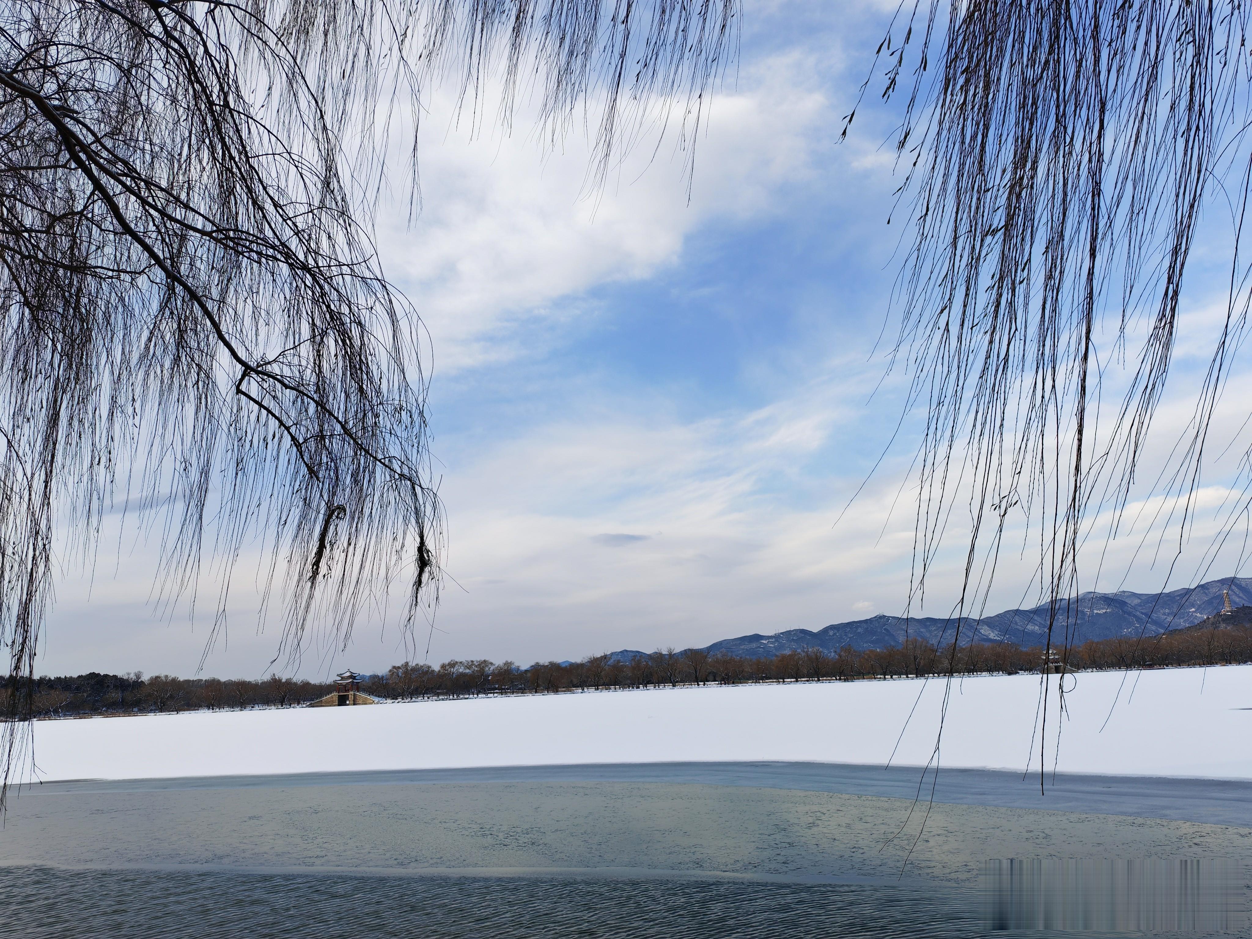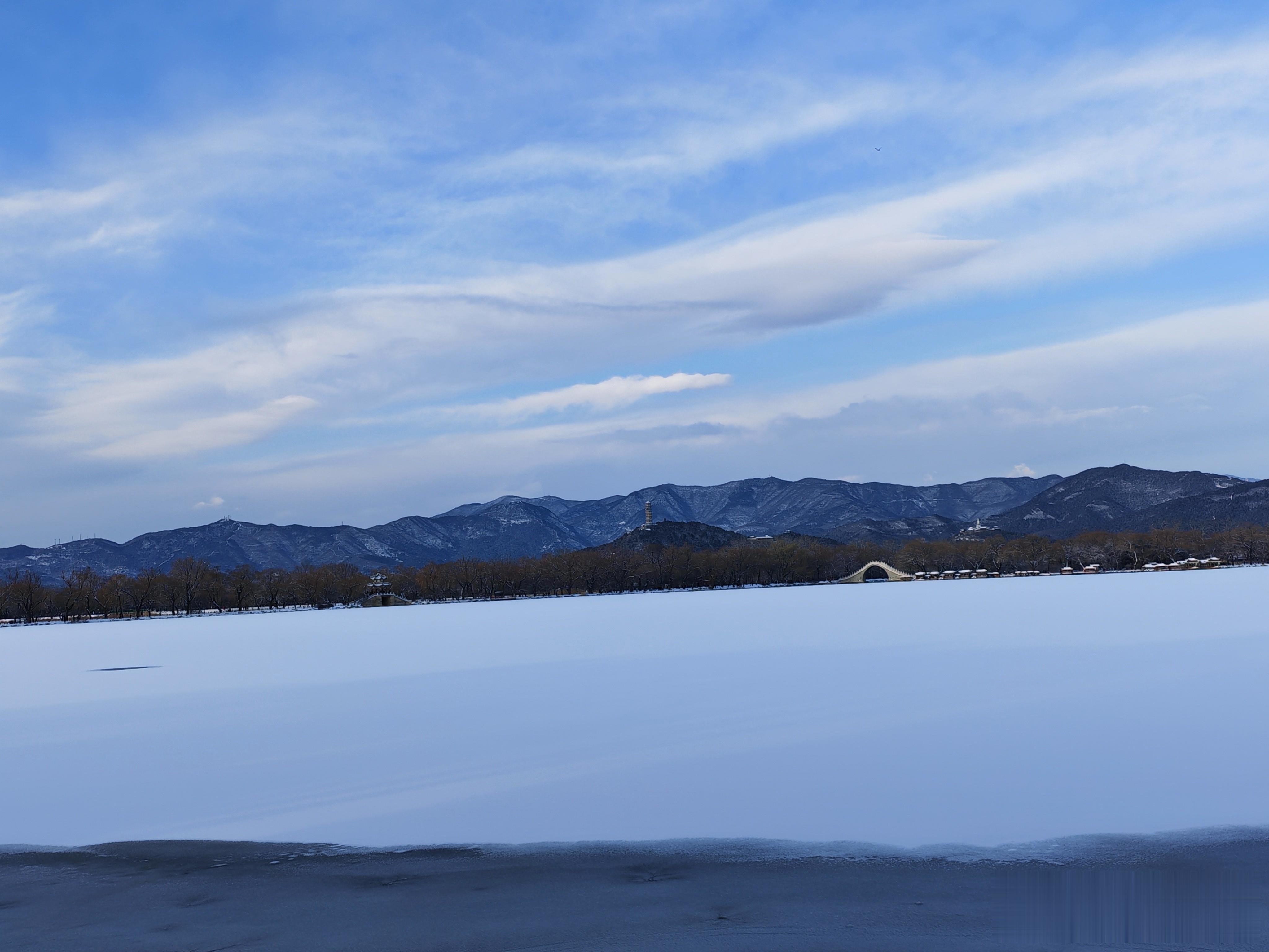 雪锁颐和,琼枝玉树覆宫墙。长廊素裹,十七孔桥卧雪如银虹;南湖岛亭台堆玉,万寿山黛色埋霜。踏雪而行,看湖冰映天光,一朝梦回康乾盛景,满心皆是冬日园林的清绝与旷远。